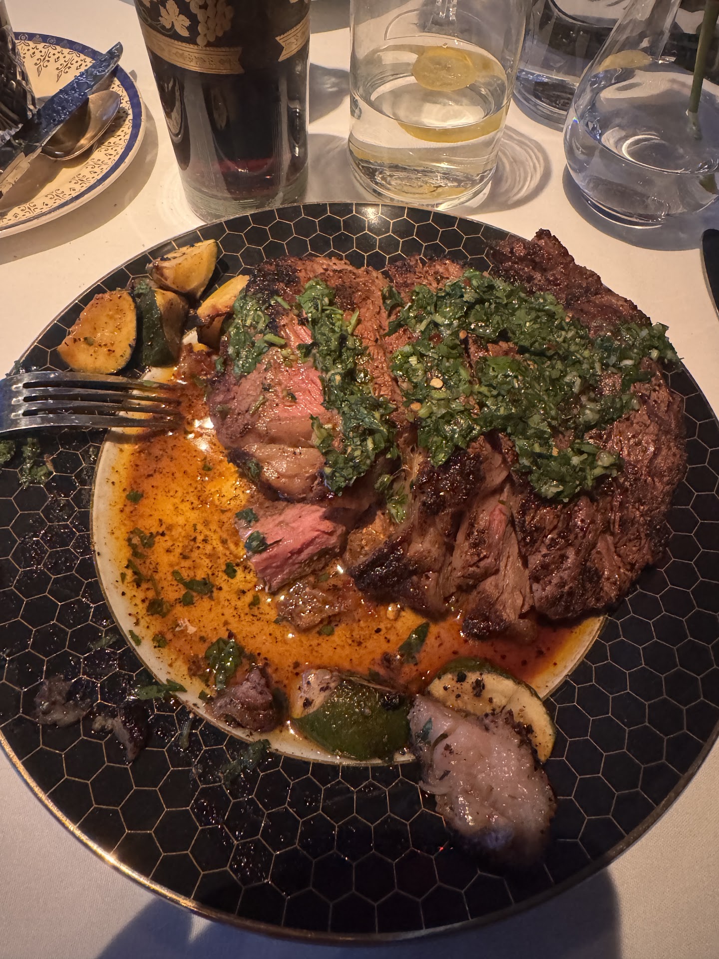 For our entrees I had the 24 oz ribeye and my wife had the tilapia. Both were cooked to perfection. There was a spectrum of flavors for the ribeye and every bight presented something new. I would love to know what the steak was cooked on as it was very flavorful and a perfect medium-rare.