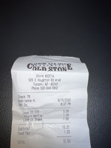 Read moreWe came to this location last night at around 9:30pm. Youâd think by the way the girl working there it was closing time soon by the way she was rushing just to get us out the door. I checked on google and it said they didnât close until 11pm. There was no line the other customers there were sitting down and had already been helped. They had a new Valentineâs Day signature ice cream out. So I asked the girl working to try that one. She just gave me the ice cream and handed it to me without putting any of the toppings in it. We let her know that I wanted the signature ice cream with toppings and she says âoh itâs new I donât know whatâs in it can you just tell meâ they were out of some stuff I get it. So she raced to get the next order we had done. And then she hands me out ice cream after I asked for lids twice. Then she takes the lid and throws it at the counter top where I clearly see itâs super disgusting and dirty. Iâm not the type of person who goes and writes reviews a lot, however the service I experienced here was complete trash. The girl working last night looks young and new to the working world, that does not excuse the lack of social skills and class she showed us. She needs educated by cold stone how this business wants to be represented. I have gone to other cold stone locations and this is not how the service...