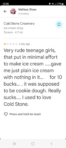 Read moreI visited ColdStone Creamery approximately an hour before closing time and was met with appalling customer service. Upon entering, I was completely ignored by the staff, who were engrossed in personal conversations and preparing orders for DoorDash customers.