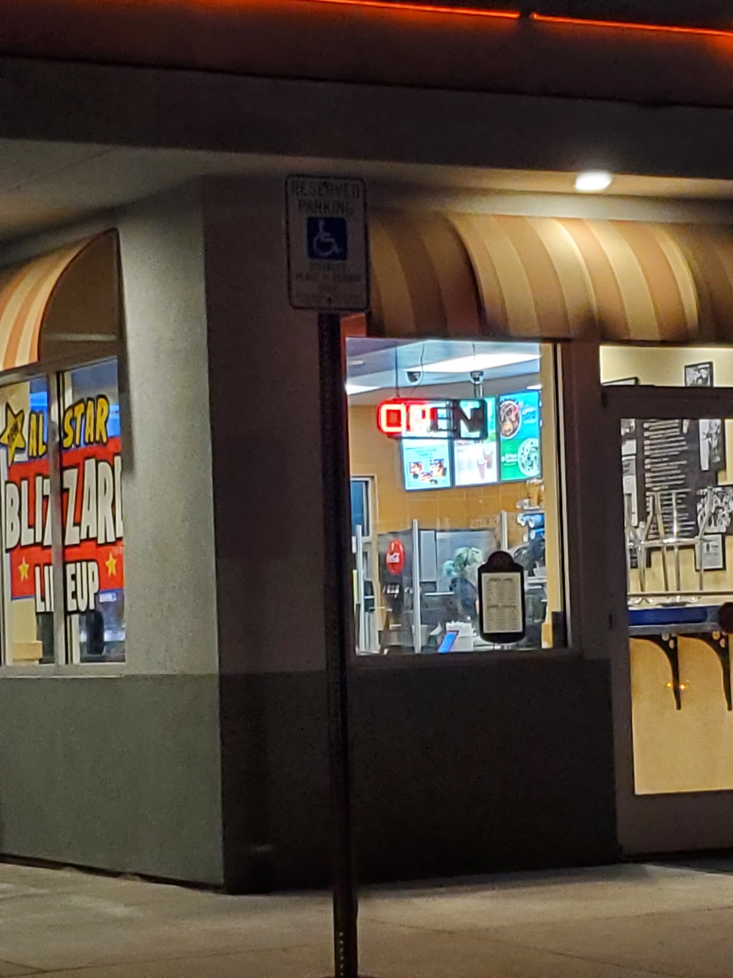 Read moreFirst time I visited this location it was about 15 minutes after they were supposed to open and the employee was chatting on her cell phone while she unlocked the door and let me in. She didn't have anything prepped for the day, and was rushing to assemble her line. I couldn't believe my eyes when she was pulling dishes out of the sink in the back, spraying them down real quick, and then using them to make my blizzard's. I've worked in the service industry long enough to know this is clearly a health code violation. Lastly, she was in such a hurry that one of the blizzard's she threw together was definitely not thick enough to serve upside down. I'm sure she was hoping I didn't say anything, because they're supposed to give a coupon for a free blizzard if they don't serve it upside down... She was nice, so I let it go. Maybe she was just having an "off day". On a positive note: the lobby area looked very clean, so the closing crew must be doing...