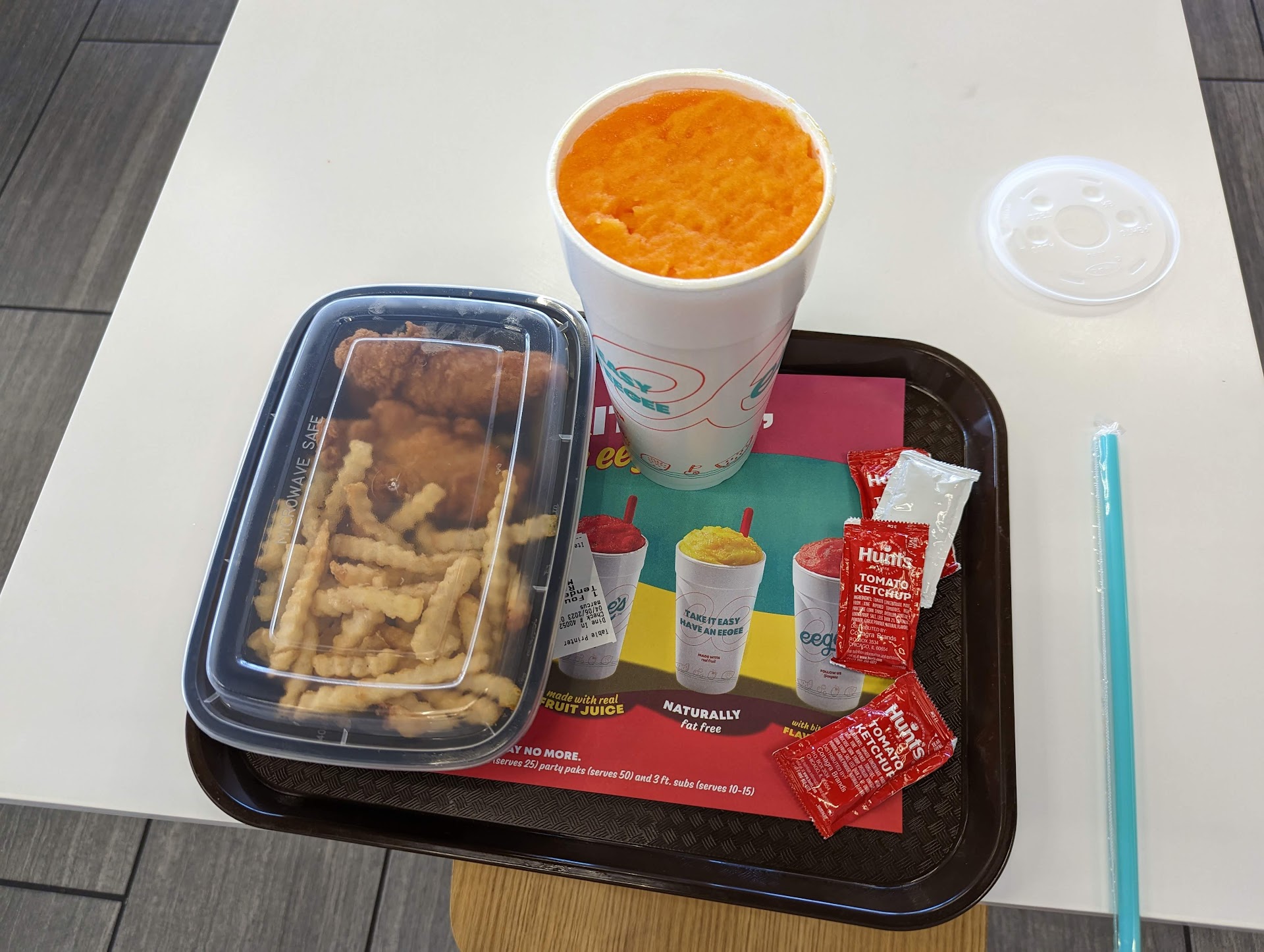 eegee's (yep, all lower case) is a restaurant that specializes in a frozen treat or icy beverage called an "eegee". We'll there, I ordered a chicken tender basket with fries and a watermelon pineapple eegee. My food came fairly quickly within about 2-4 minutes. My friends order took about 10 minutes. The watermelon pineapple eegee was overall good but not quite what I was expecting. I had assumed it would have the consistency of a slushy or something more liquidity and easy to drink with a straw, but it was not. The eegee was more like an Italian ice and would probably be better consumed with a spoon. The eegee had small bits of pineapple mixed in and was very fruity and flavorful. The chicken tenders were well spiced and tasted fine. My only real complaint would be the lack of dipping sauces. Eegee's only offers ketchup or ranch as a dipping sauce. This feels like a pretty big oversight given that some folks love their dipping sauces. In short, good tenders but no sauce makes for an awkward experience. The fries on offer were fine but not stand out. Overall, I enjoyed my meal there but would have enjoyed it more if they had more dipping sauces on offer.
