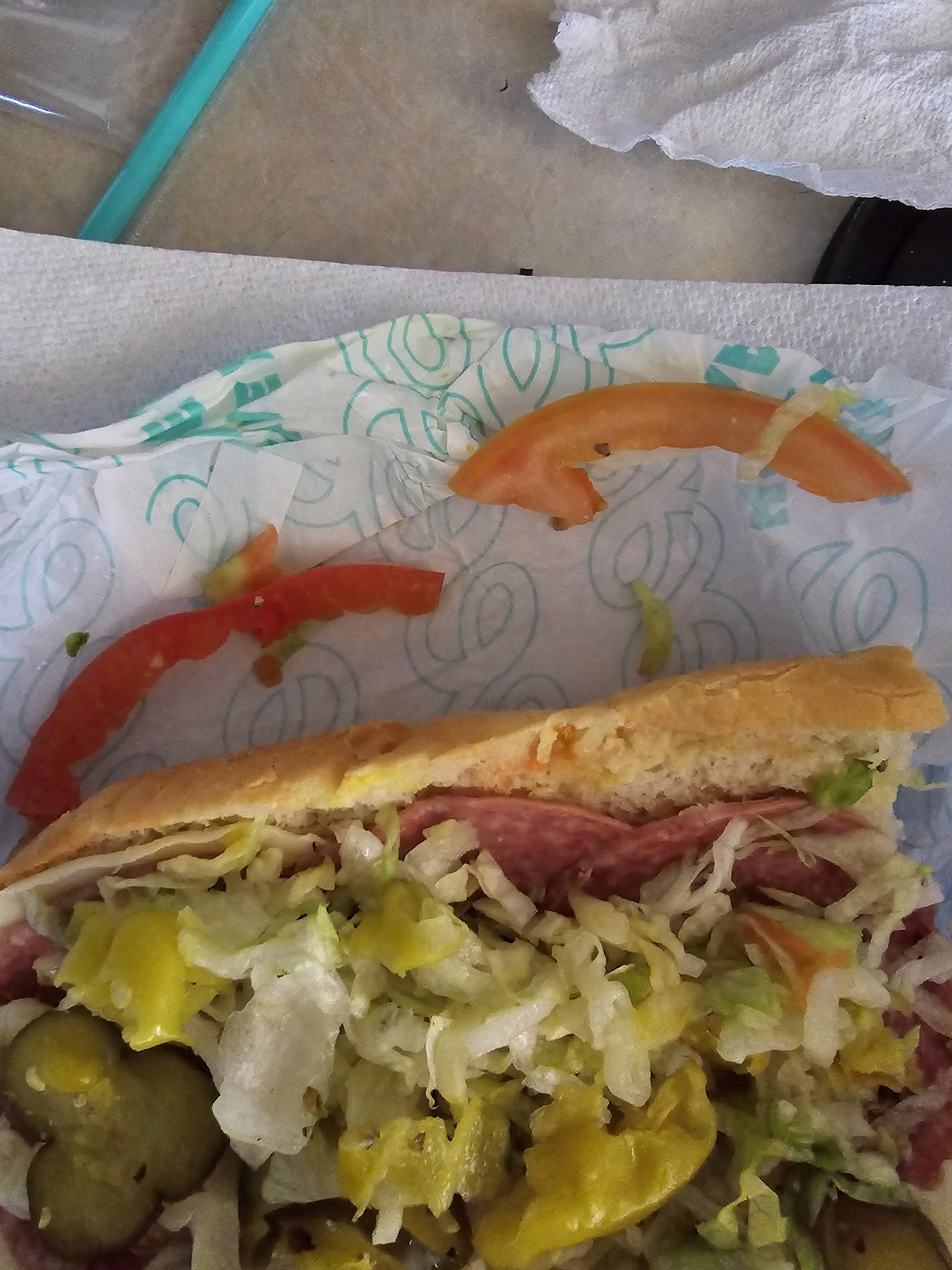 6/26 update: I visited today and went inside to order, which I never do. I asked to substitute extra salami and omit the ham and had to pay extra, which is unfair in my opinion. I observed ALL the buckets of eegees on the floor as an employee was mopping a mess that was made. No way was I gonna order an eegee's that has to be scooped from a bucket on the floor GROSS! Of 3 employees I saw, only the one mopping seemed like a happy person. He was taking lobby orders and had a headset on and was taking drive thru orders also. There was a guy at the window, so I'm not sure what was up with that. No one had a smile. My order came up, and no one budged to give it to me for a few minutes. It was the one who made the sandwich that gave it to me eventually and he looked disgusted the whole time. I won't go to this location again. What happened to the tomato? As you see, one sliver is soggy, and the other sliver is good. But where is the rest of the tomato slice? I want a slice, not a sliver of tomato skin. Paid over $30 for 2 meals, and I expect better. They put the sliver of tomato on the top, making it look like there is a full half slice of tomato. Come on, Eegee's?! I know you are better than this!!