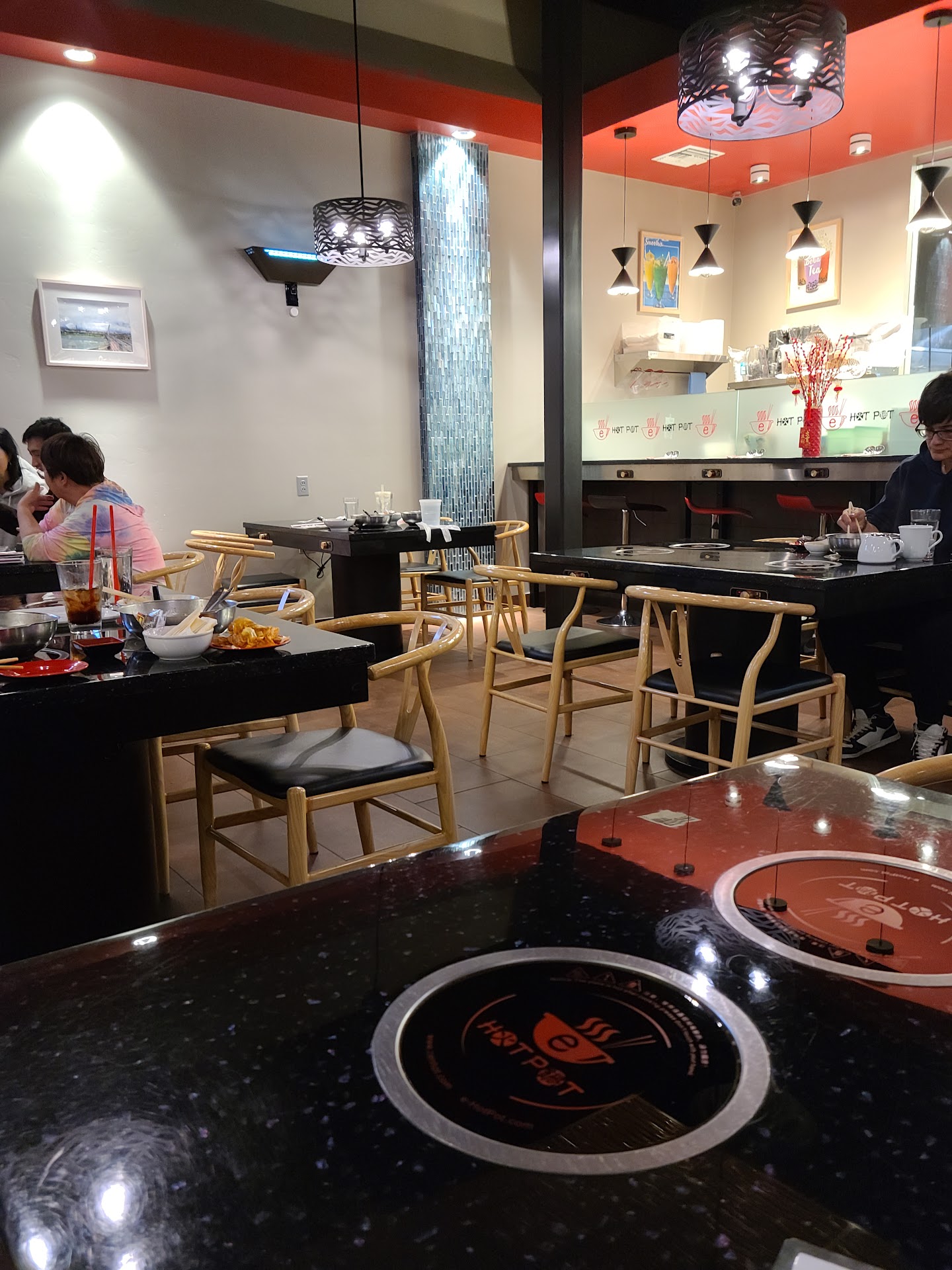 Read moreThis was my first experience with a hot pot. It's an interesting concept - you choose one from the menu (I got curry), and they bring you a pot with some vegetables, broth, and a few side plates with mysterious things (battered shrimp, rice paper covered meatballs one pork and one beef, and a fish cake - all raw), and a large plate of your chosen meat (I did chicken) which is also raw. You also get either a bowl of rice or noodles (noodles need to be cooked by you - I don't know about the rice). The vegetables and broth go on the burner at level 3 or 4, and you wait for it to boil. Then you can cook your other raw stuff in it. It's quite confusing as to what is raw and what you cook and for how long. I personally thought it was interesting but a contamination hazard, especially if the server is not clear about all of the things brought out. I guess I am not used to having raw chicken put in front of me. There is also a toppings and sauce bar to get dipping sauces from. That was also interesting. I would have thought if you were cooking everything in a hot pot of curry, that's your "sauce." This is a good experience to have once, but I probably won't do this again. If I am waiting 15-20 minutes for food, then I have to cook it for myself for the same amount of time (an additional 15-20 minutes) I might as well have ordered an already cooked dish that comes out in 15 minutes and have eaten it by the time a hot pot is just finally boiling. Seems kind of lengthy to get to an edible...