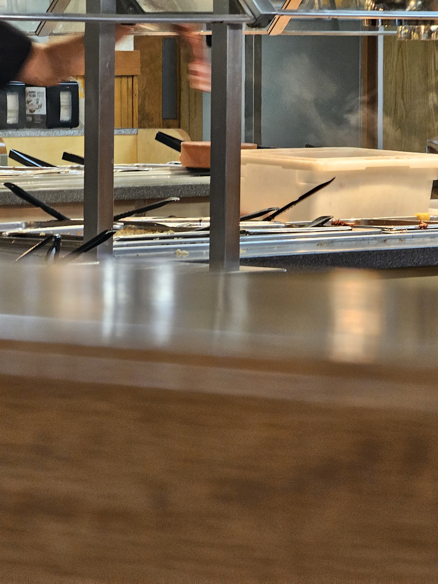 The salad bar exists purely for irony. Nobody’s ever touched it. It’s there as a visual gag, like a reminder of what vegetables looked like before America gave up.