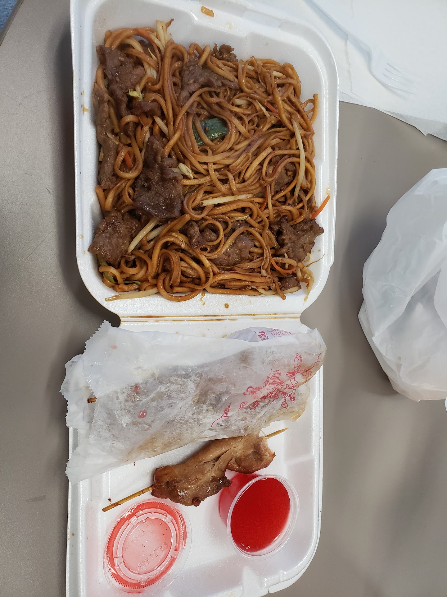 We had the Mongolian Beef, Sesame Chicken, House Fried Rice, and the Sampler platter (crab cakes, chicken skewers, egg rolls, and shrimp). To the positive, everything was hot, fast, and generous quantities. Now, the reason for the low score. We sample the same items at restaurants all over to get an equitable standard. Never have we got Mongolian beef with green pepper. This is unfortunate because green pepper has a distinct flavor that just destroyed the unique flavor blend associated with the Mongolian variety. Imagine a fusion of beef and peppers and Mongolian beef. Mmm....No. A real dissapointment. My beautiful bride was impressed with the egg rolls, which are often a greasy mess, were excellent and crispy here. The mixed fried rice was full of shrimp, chicken, and huge chunks of egg. Very good. Some notes about amenities. If you eat in, know that this establishment uses plastic forks, which are a challenge for the crisp items such as the Sesame Chicken. Also, plastic forks are the only utensil available to serve up your food from the fine serving bowls....Styrofoam take-out trays. We were less than impressed. It's budget all the way. Enjoy the food...but bring your own serving spoons...