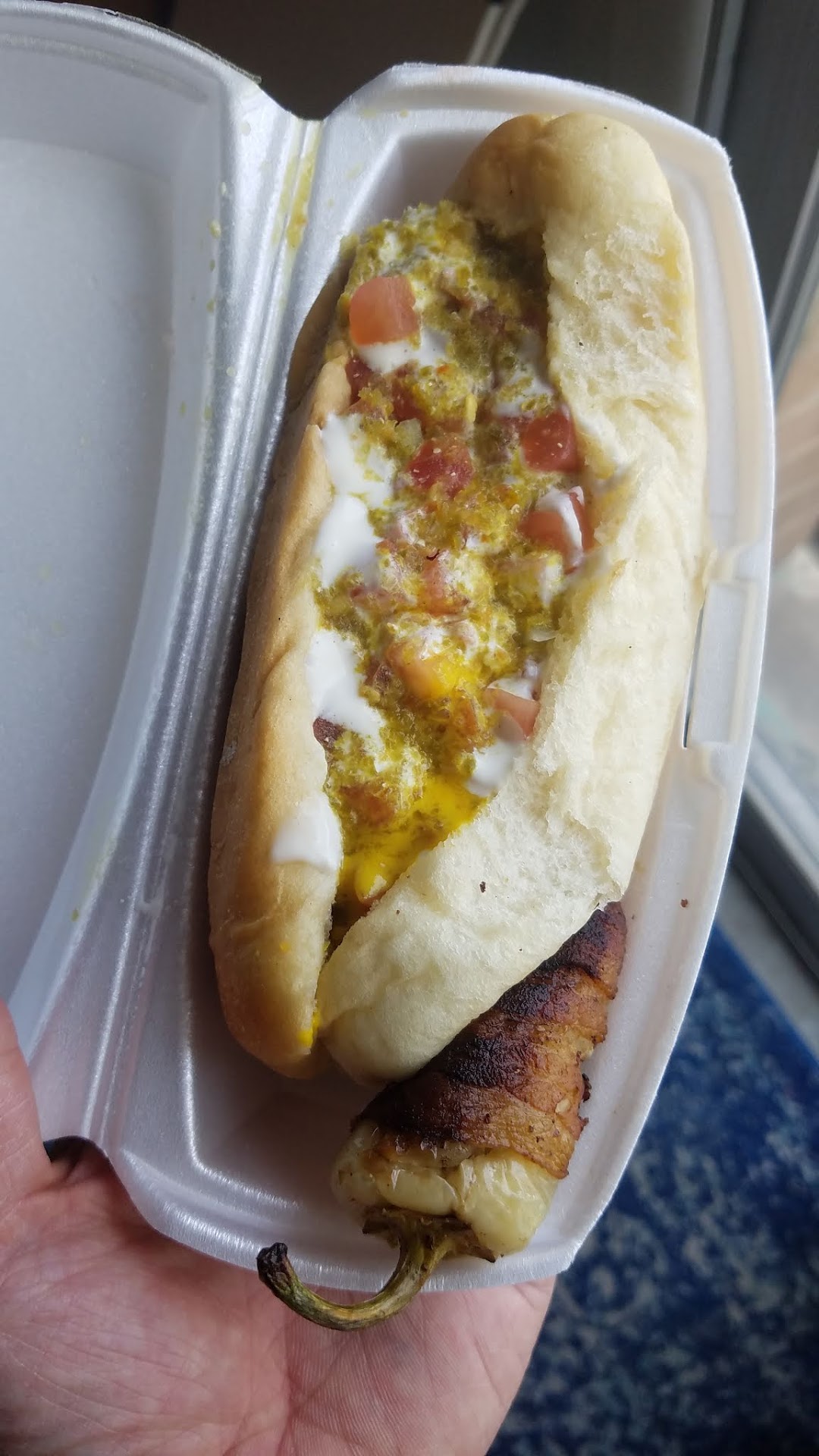 Updating review as the quality has gone down. They used to stuff their chiles with cheese and wrap with bacon, now they are plain grilled like every other hot dog cart. I think they switched the hot dog too, it doesn't seem as flavorful as before, and if this last one was wrapped in bacon, I couldn't taste it. A shame as it used to be one of my favorite hot dog carts. Probably average 3 stars for hot dog now, but leaving a fourth star because their tacos are still...