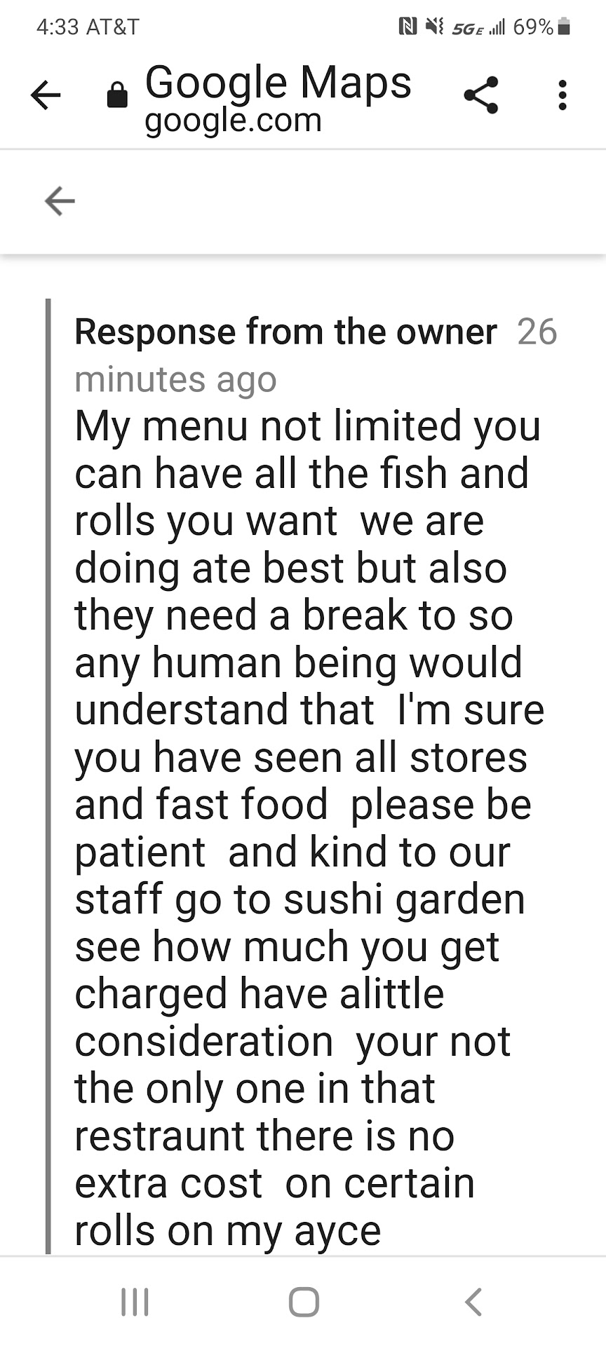 Ā Ā Ā Read moreIf you order soup, appetizers, and entrees, do not expect to get them in any sensible order. You would think they would bring your soup, salad or appetizers first. Oh no, that would be too easy. The bowl of miso soup tasted like they could have added two more bowls of water and then it would be good. Otherwise it tasted like it was made from concentrate with no water added. I went there for lunch today with a friend who apparently knew the owners. I thought perhaps that would warrant better serviceā¦perhaps?? No such luck. I approached the counter and asked for my soup because I knew (like the last three times I had been there) that it was going to all come out at once unless I said something. When I did say something I could tell that they thought I was an @$$hole. Hey man, Iām paying, I donāt see how hard it is to serve your patrons in the the order of how their food was ordered. Who wants their entree before their appetizers? Additionally, some of their responses to a few of these reviews clearly show us the mindset of the owners (e.g., Confrontational, Defensive, etc.). But hey, a lot of people love them. But sadly, a lot of people seem to settle for less. I wish the all the luck in...