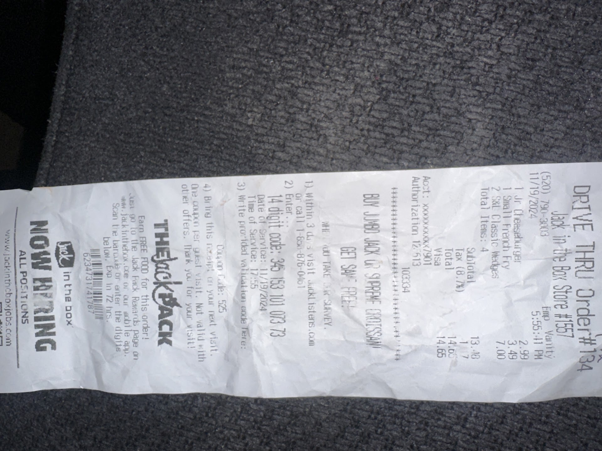 I came to this Jack-in-the-Box on golfing in Wilmont Store number 1557 drive-through order number 134 On November 19, 2024 at 5:55 PM I had a very simple order, one junior cheeseburger, one small french fry and two classic cheddar bacon wedges. I went through the drive-through, paid, got home and realized they did not give me the small french fry. I called the store and right off the bat. I was literally thrown back by how unprofessional they are at the store, a man answered the phone he did not apologize, when I told him what I was missing, he said. â Can you come pick it up?â I told him I could pick The small fry up, but itâs frustrating because you guys shouldâve checked the bag before handing it out and now I have to travel back your way to pick up a small french fry and then he stay quiet and I said hello, and he said we will see you when you get here he hung up the phone. I drove back up To the Jack-in-the-Box I walked inside and they told me that they could not remake my order. I told them well. Itâs unacceptable for one that you guys messed up my order by not giving me everything that I paid for and itâs unacceptable that I had to travel back 20 minutes to pick up a small fry and I was not about to have the rest of my food cold and I brought the food in the bag untouched I told them that they needed to remake my order and include the small Friday as they forgot I didnât ask for anything extra, I wasnât rude about it, The cook, whose name I found out is Johnny was giving me pushback about remaking my entire order, even though I had the food that they gave me in the bag with me, and then went outside, and I called one of my best friends that also works at the Jack-in-the-Box, but at a different store And I was waiting outside, which seemed like forever and put it this way, originally I went to the drive-through at 5:55 PM, I didnât get my order until 7:28 PM. They had me waiting over an hour for my order and then they proceeded to tell me two times to please not complain. I Had Three small children in the car. They were aware of my children in my vehicle, and they still had me way over an hour for my food. Meanwhile, they were parking every single car at the drive-through and running people out their order. Meanwhile, Iâm standing there waiting for my Order. I am owed an apology because I never got one and I do expect some type of compensation because itâs just ridiculous. The customer service sucked, the fact that I had to wait over an hour for a simple order because the cook Johnny had a chip on his shoulder for whatever reason, then running our orders, knowing that Iâm literally standing there waiting for my order. Itâs all ridiculous. The fact that One of the girl employees came out and said that she was trying to convince Johnny to remake My order and that if it was up to her if she wouldâve jus Remade the order already. So then you fast-forward to 7:28 PM and she runs out with my food and she says, hey, I finally convinced him to remake your order. Please donât complain, please donât complain. Absolutely unacceptable in so many ways, I must also mention that while I was waiting outside for my order that Johnny, the cook, thought it would be a good idea to walk around the corner and throw his hands up at me. This is not the first time that Iâve had a very high concern with this store, they need to get it together because they are absolutely terrible. I hope that Jack-in-the-Box corporate or whoever read these reviews looks at the camera footage and they are literally going to be flabbergasted when they see that I was literally waiting over an hour...