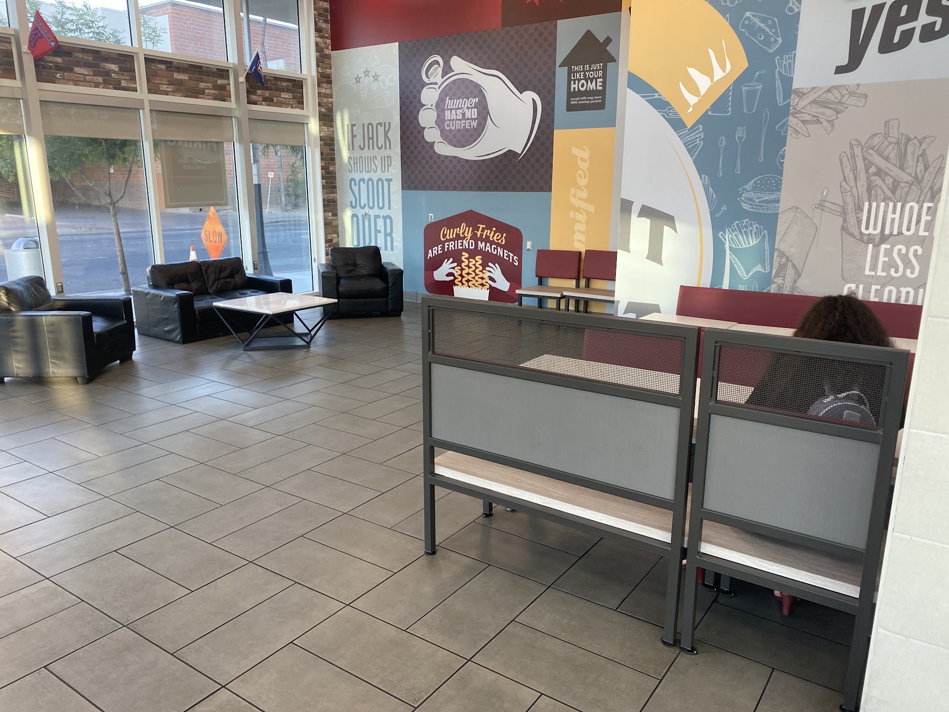 Read more:(Damned Bathroom Trolls): I do have a bit of a problem with this specific location, due to the fact that they always try to act as though they don't have a public restroom, WHEN THEY CLEARLY DO HAVE ONE! Not to mention the fact that every time I have used the restroom facilities here, ,someone tries to open the door and barge into the bathroom every 2 - 4 minutes until I am out. However, once I leave the restroom, there is never anyone waiting outside the door to use it; which irritates me when I hurry up to be courteous....just to find out there is no one waiting. Interestingly though, ,I have witnessed this particular activity countless times, ,and I even just go in to buy $1 tacos just to use the bathroom so I can experience the the intrigue of: some employee incessantly pretending to need the toilet only to make me uncomfortable so I hurry-up and leave. Sad.... However, this Jack in the Box is located right in the 'hood so-to-say, and doesn't attract the nicest or best looking patrons. The quality of the food here is consistent with other locations I have visited across the USA -Which is...