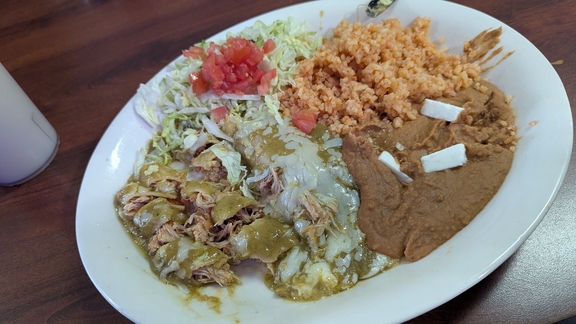 I very often go to a different restaurant but they are closed on Tuesdays! I can order the exact same thing chicken enchiladas and refried beans and know that everything, including the beans are very tasty and delicious and authentic. For lunch it also includes your drink for free. I pay $13.65, that includes tax, plus I pay an additional 20-25% or more tip!