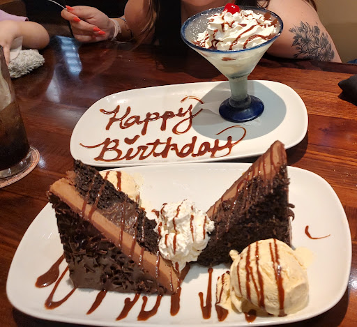 Now, for dessert, the birthday girl had a coupon for a free one, plus the restaurant gave her a birthday sundae. We chose to have the Chocolate Stampede dessert to share. Good Lord, that thing was huge! Chocolate cake with a chocolatey, custard/mousse-like topping and two scoops of vanilla ice cream and whipped cream made a perfect ending to this awesome meal. We couldn't finish the cake even though there were four of us attempting the task.