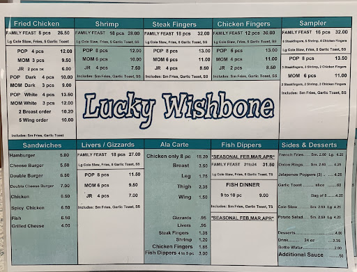 Read moreWell I drive by Lucky wishbone nearly every day and have always wondered about trying it out, one day I decided to go for it and this is my opinion. first of all what I ordered was the sampler box it was way way way overpriced for what it was. It consisted of two small-sized chicken tenders, three breaded shrimp, two steak fingers, and some french fries that left a lot to be desired. it had a side of the Lucky wishbone sauce which was very similar to a cocktail sauce that you would use when you're eating peel and eat shrimp. This cost me $11 for this small amount of fried garbage. The quality of all of the food was not something I would ever pay $11 for again, especially when I can drive a few blocks and get a full meal at raising Cane's with six huge delicious breaded chicken fingers, french fries that are actually good, a piece of Texas toast, a side of coleslaw oh, and a delicious side of cane sauce which is absolutely incomparable to the Lucky wishbone watered down ketchup sauce that came with my overpriced sampler. As soon as I put the order down that I received I was already feeling some kind of way about the food I had ordered. Facility did appear to be somewhat clean and the staff was about average. in my opinion you're definitely not missing anything if you skip over Lucky Wishbone for today's...