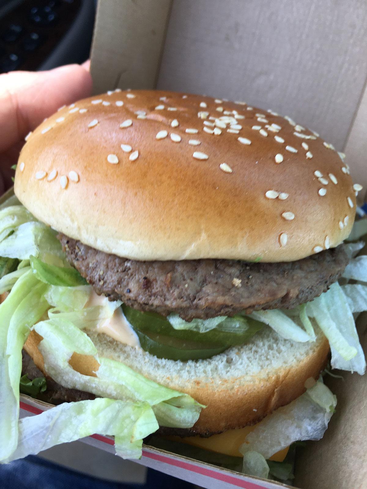 It’s the rough equivalent of the Big Mac, with two beef patties, a single slice of cheese (“double” cheeseburger?), lettuce, onions, a slice of tomato, “Classic Sauce” on a plain bun with no sesame seeds. The beef charbroiled. (A short sentence packed with meaning much like “Jesus wept.”)