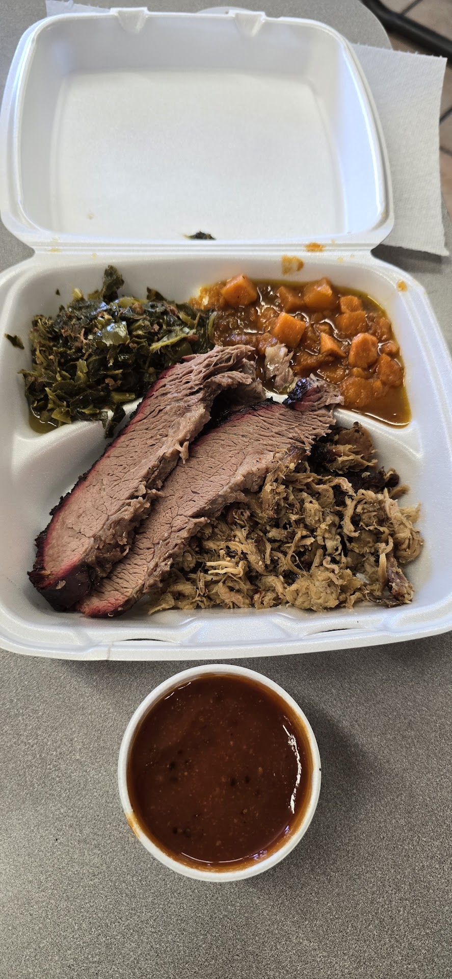 I ordered the brisket plate, which came with a side of delicious mac and cheese and the best-tasting coleslaw I've had in a long time. The brisket was tender and flavorful, perfectly complemented by the creamy mac and cheese and refreshing coleslaw. The portions were generous, and every bite was a delight.