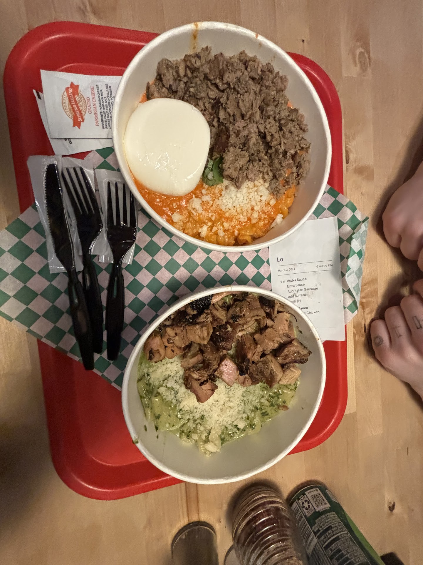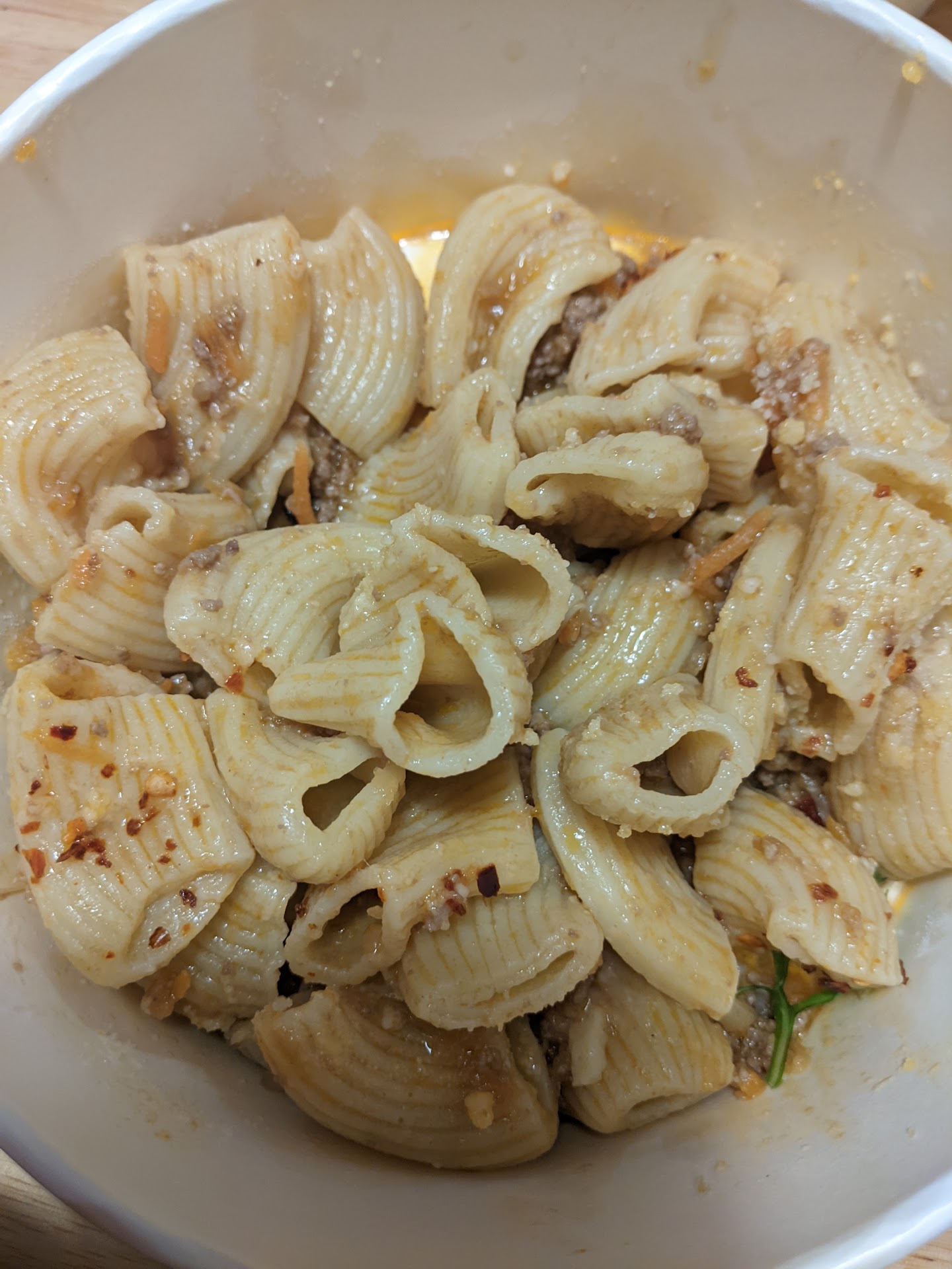 The downside is that it's expensive. $13 for a paper bowl of noodles with sauce is a little bit steep, but not egregiously so, and totally understandable given the cost of running a restaurant these days.