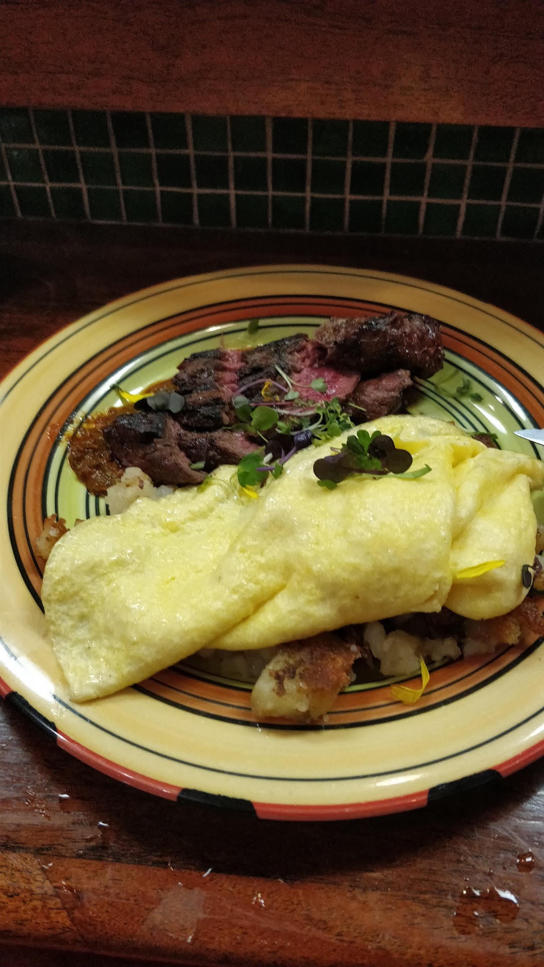 Read moreI hesitate to give the Nook 5 stars only because I have only had one dish there but the one dish that I had was excellent. If the other dishes are anything like the hanger steak and eggs then the Nook definitely deserves 5 stars. Even without trying another dish I wouldn't hesitate to give them 4 stars. I ordered the hanger rare and the eggs scrambled. The steak was prepared beautifully with a light sear on the outside. The smoked chimichurri that was under the steak is one of the best sauces that I have ever tasted. It has a nice vinegar bite that goes well with the cilantro and a final touch of heat. I would probably say it was a 4 or 5 out of 10 on the heat scale but keep in mind that I order 5* Thai food. The sprouts that topped the steak added a little crunch and a nice contrast to the chimichurri. The hash browned potatoes were seasoned well and had a nice inner texture that was finished off with a slightly crispy shell on most of the pieces. I ordered the eggs scrambled and to my surprise I got what looked like a thin omelette. I have no complaints because they still tasted fine.