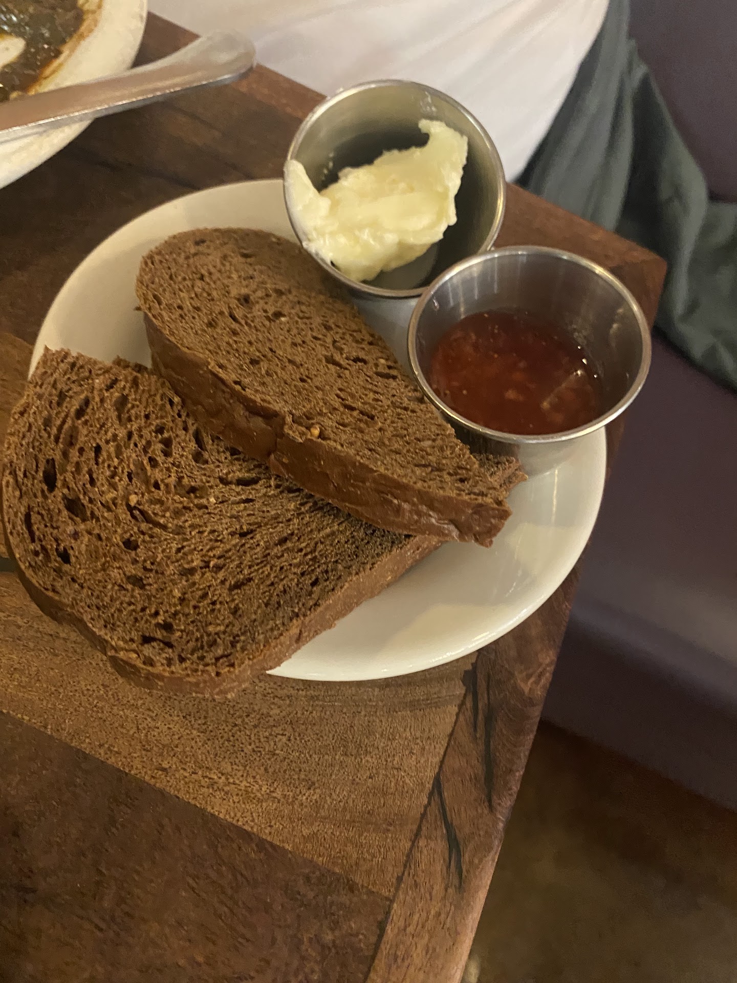 Nonetheless we were seated and had a truly wonderful brunch. Loved the menu items, they felt super unique and different or at minimum a different spin on a traditional brunch/breakfast item. We started with some Latte's and I will tell you to hard pass on dropping money there. The milk was barely warm and they just didn't taste that great. We also got the protein carrot bread to share and it was REALLY delicious. Made up for the espresso drinks and cranky hostess.