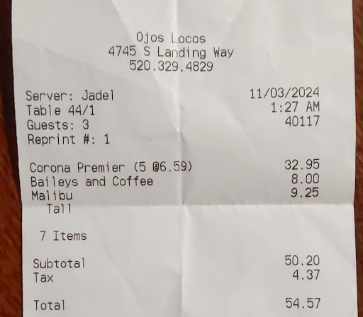 So, there you go potential customers, Ojos Lokos Tucson does not care if it causes an accident, as long as everyone at the table is drinking, cause they WANT their trade going!