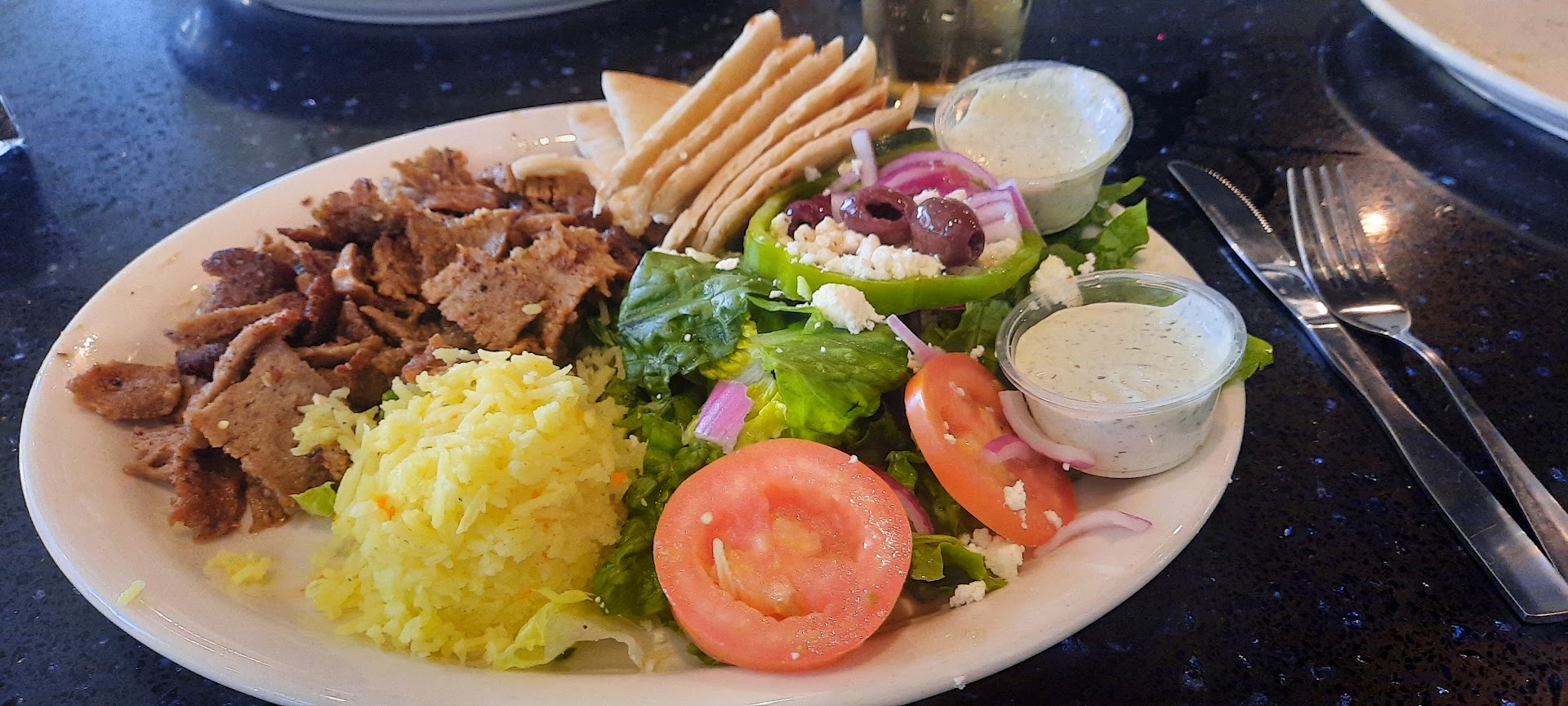 I opted for a beer from a good selection of reasonably priced tap and bottle beers. Wine and cocktail choices are plentiful and also priced well. My wife went with her usual Diet Coke. We were surprised when we were brought a complimentary starter plate (Meze) of hummus, tzatziki, cucumber and pita which were all very tasty. We couldn't pass up on the Flaming Saganaki for an appetizer. Flamed tableside with herb leaves, tomato and lemon, still sizzling when they set it down, accompanied with soft, warm, slightly chewy, nutty flavor pita bread wedges. The saltiness of the hot gooey caramelized cheese along with the lemon on some pita was a great taste sensation. Ordering our entrees was difficult as they have all the classic Greek offerings, but we zeroed in on gyros. My wife ordered the Classic Greek Gyro Sandwich with a Greek Salad side. Greek Fries are an alternate choice. I chose the Gyro Platter which came with lemony Greek rice, Greek salad, pita and tzatziki. Even with as busy as this restaurant was, our meals came out quickly. All the classic Greek salad components with an excellent dressing - not too much vinegar and not stingy with the feta cheese. The rice was perfect with just the right amount of lemon. The pita was warm and soft. We were totally impressed with the gyro meat which is cut off of rotisserie spits. We suspect they make their own as it was not as smoothly processed as most and had a great texture. It was cut much thicker than any we've had before, almost resembling sliced steak. A perfect mix of lamb and beef, garlic and spices and just the right amount of fat, allowed to crisp a bit on the spit. And the amount of meat on both entrees was enough for two people. We brought enough home for a full lunch the next day. This will become a regular place for us as the food and service is great. The challenge for us will be to order something other than gyros. You will not be disappointed dining...