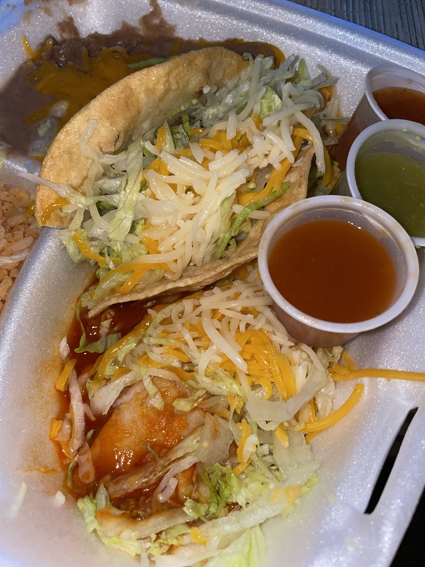 I've been to A LOT of late-night drive-thru Mexican restaurants that all remind me of each other. However, Paco's stands out. I ordered combination plate number one, which comes with a beef taco, cheese enchilada, refried beans and rice. As soon as I got the food the aroma took over my entire car and I had to control every bit of me to not dig in while behind the wheel. The minute I got to by Airbnb, I didn't even bother unloading the car. I ran straight inside, sat at my table and ate away. It was SO GOOOOOD, especially the beef taco. It was super flavorful, and stuffed with delicious, slow cooked meat. The cheese enchilada was amazing as well, dipped in both red and green sauces which I was generously provided.