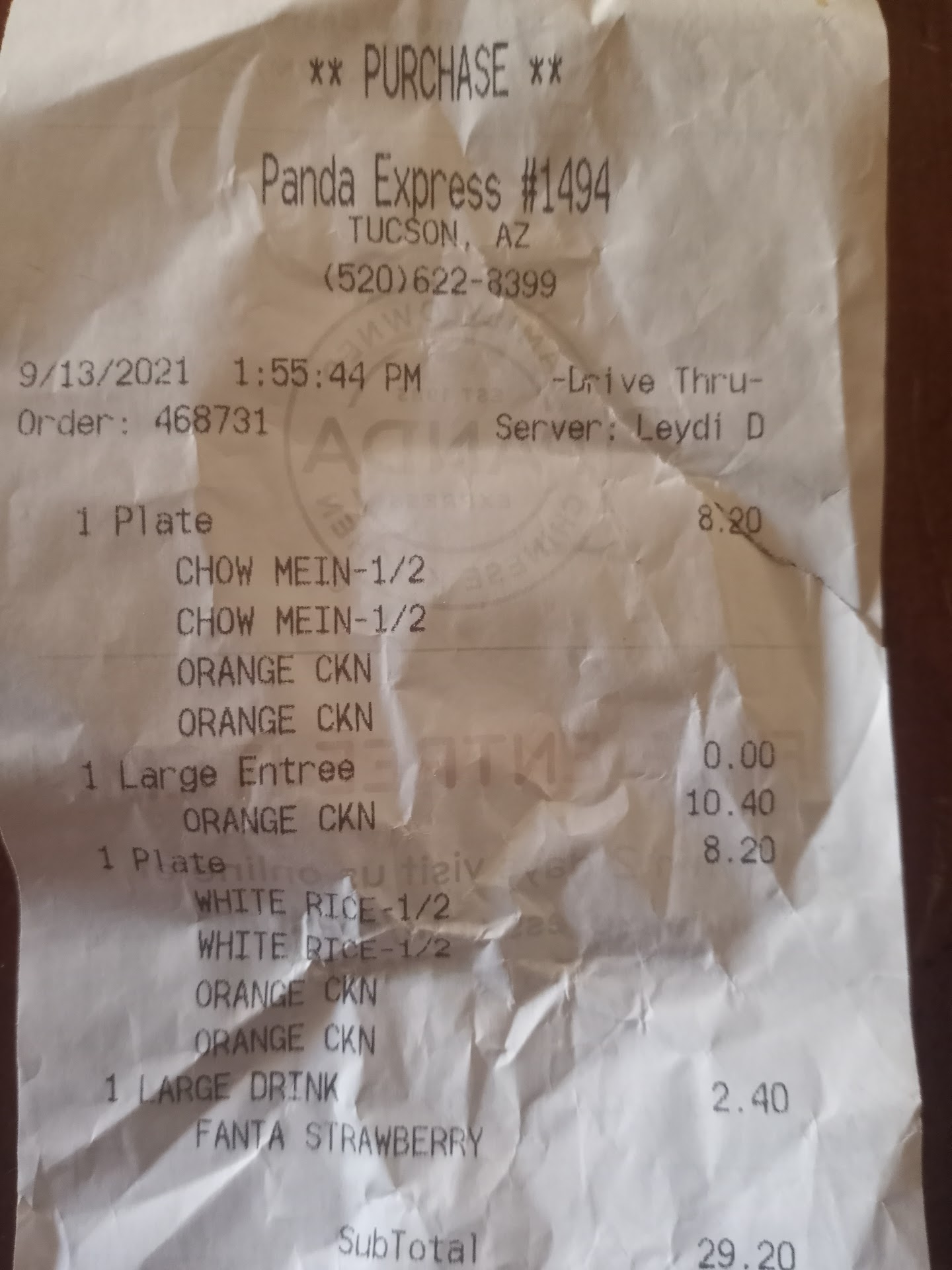 Got a plate today. They wanted to charge me @$13.00 for it, and the proportion was not much. I pay the same price at the house of chein and get a huge real plate with white rice 🍚 on the side yup on the side, not with the main entrée so it's much less. I'm done with Panda. I will drive the extra mile to order at the House of Chein any day. And it tastes way way better, making panda smell like crap. Seriously, the orange chicken from the panda smells like piss. Beef broccoli smells like cat food. The rice was hard and dry.