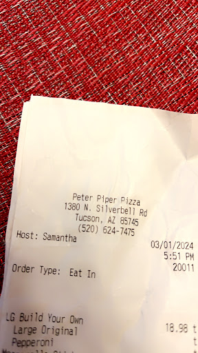 Read moreThis Peter Piper Pizza has a limited entertainment center in contrast to other PPP's but it's convenient for all the little league teams of the nearby park. The pizza is about as good as you can expect for a corporation whose target demographic is 4-14 year-old kids.