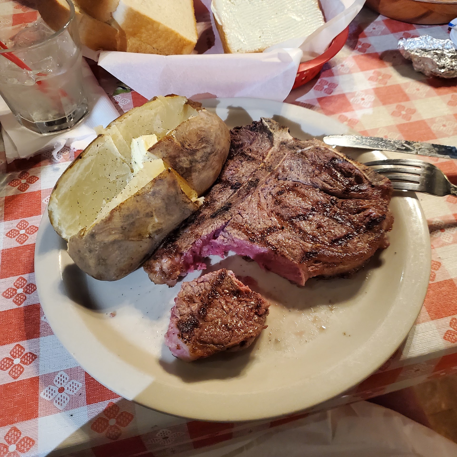 Read moreHadn't been here in years. Thought we'd give it a try. Should have stayed home. Got the kiddo a kids steak and corn on the cob. Steak overcooked. Corn had come in contact with BBQ sauce from someone else's food so it wasn't appetizing. Salads were ok. Never did I think I'd say there was too much dressing on salad but it was drenched. Good, but drenched. The bread they brought was hard as they must have set the baskets up long before it opened. We were three of the first 8 people seated when they opened. Ordered chicken and t bone for adults. Steak was so tough you couldn't even cut it. They cooked another it was the same. Said we should pick another cut because the cook said the t-bone cuts the got in just weren't good. Why are you serving them if you know you got bad cuts? And for $40 at that. We picked a different cut and it was ok. Ate the baked potato straight out of the foil while waiting to get steak so it didn't get cold. Bbq chicken, flavorless beyond the sauce on top. They must be using tiny chickens as this half was really small. Breast of it so dry. Inedible. Didn't say anything, after the steak debacle didn't want to be those people. Beans were good as always. Peach cobbler. Gross!!!!! The whole thing was MUSH! it was just awful Our waiter was kind and patient and did his best. We knew none of our bad food was his fault. Would I go back? NO. Not for the $80.00 I spent. We didn't even get to eat together or have anything enjoyable to eat. Trail Dust Town is fun for the kids but nothing is free. If you go, be a rule breaker and wear a tie. Don't order a t-bone or half Chicken. Pit beef is probably safe. Lol have fun and enjoy the whole...