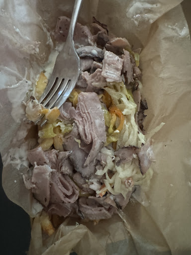 We took our to-go order home. My spicy steak was smothered with the disgusting "queso sauce" I'd explicitly ask not to have. Two bites later it went in the garbage... totally poor quality meat, and that yucky yucky "sauce." The rosemary bread was good.