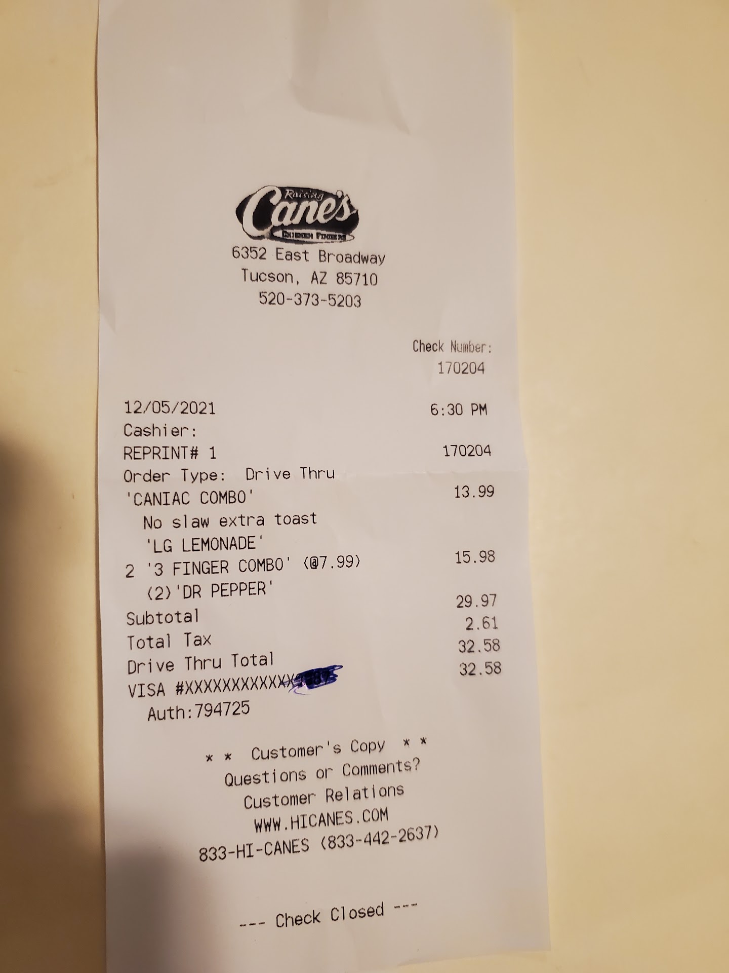 Read moreCame through the Drive Thru on Sunday evening. 12/05/21. Young lady outside taking order and payment was okay, however, no receipt given nor was I asked if I would like one. Get to the pick up window and they try to shuttle you through as fast as they can without providing an excellent experience for the customer! I was handed my drinks and food and I had to ask the employee for my receipt before she ran away. She asked me if it was in my bag. I looked and it wasn't. Then they had to call for a manager to find me my receipt apparently. Call me old school but I like to see a breakdown of what I was charged for. All customers should be given a receipt or asked if they would like one. Meanwhile the line was about a mile long behind me and this took a few extra minutes to get a receipt. Should have taken 2 seconds and be common practice. After that I had to ask for ketchup because none was given in our bag and nobody asked me if I would like any. The employee working the window seemed annoyed at my requests. They sure want your money quick though and keep jacking up the prices. To put the icing on the cake, our Caniac combo meal was missing a chicken finger. Suppose to have 6 and only 5. I have had problems with this location before. This might have been the last straw. I will take my money where it's...
