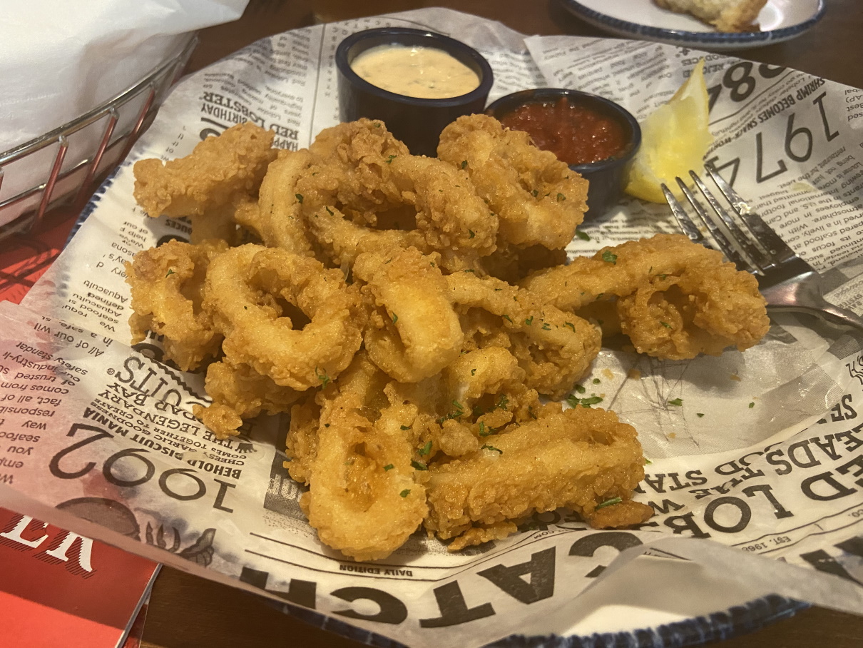 Consistently Good Service and Food We visited on a Friday evening at about 4:30 pm. This is in the Spectrum Marketplace in South Tucson. We enjoy going to Red Lobster and have visited many around the country. Fridays are always busy there and arriving before 5:00 usually ensures immediate seating. Plan to wait as you get closer to 6:00. Red Lobster has not escaped the staff shortage problem and thankfully, chooses to not fill their restaurants with diners when they are short of servers. This keeps the server:diner ratio in line with being able to provide consistently good attentive service. I applaud them for doing so. We were seated immediately in the consistently familiar and comfortable dining area. Beverages include fountain sodas, teas and full bar service. We kicked-off with the Hand-Breaded Calamari Starter. These came out quickly and were piping hot. A very large portion of lightly battered perfectly fried rings thicker than usual so they were more tasty, soft and tender with no rubber tire chewiness. Served with jalapeno ranch and marinara dipping sauces. Plenty here for 3-4 to share. For our meals, my wife opted for the Sesame-Soy Salmon Bowl and I chose the Shrimp and Lobster Tacos. The generous portion of soy-ginger glazed salmon was very flavorful. The brussels sprouts were halved and heavily caramelized, but not burned, and we think topped with a drizzle of balsamic vinegar. The sprouts and salmon were sprinkled with crunchy crispy fried onions. The spring mix salad was fresh with a light vinaigrette. Edamame and orzo rice were included, but were not anything special. My wife really enjoyed this bowl meal. My tacos were full size tacos on grilled corn tortillas with good amounts of lobster and shrimp. The seafood was accompanied with jalapeno slaw, pico de gallo, a tasty lime crema and fresh cilantro. I found that the breading and frying overpowered the flavor of the shrimp and lobster and when topped with all the other ingredients, I got a real good south of the border flavor in my mouth just missing the seafood flavors. I brought two tacos home for next days lunch. If we had not filled up as much on the calamari, we probably would not have brought home leftovers. The portions are always large, the service was excellent and the setting is comfortable. We will visit again, but I'll pass...