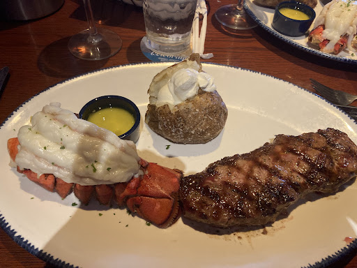 Now, the food. It was great. I take no issue whatsoever with food quality, taste, or presentation. I had the lobster tail with 12 oz sirloin - both were great. Portion size was really excellent, too. I felt it was a great value, given how good it was. Steak was juicy and flavorful, cooked exactly to temperature requested (medium well in my case); lobster tail was easy to remove from the shell, and buttery and delicious (yes the butter sauce is a nice accompaniment, as are the light, fluffy cheddar biscuits (YUM!!)). Baked potato was even really good, with the salted exterior and all that.