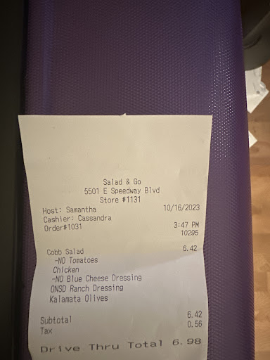 A Five-Star Experience Salad and Go on Speedway and Craycroft is an absolute gem for anyone craving a fresh and delicious meal on the go. From the moment you walk in, you're greeted with warmth and friendliness that sets the tone for a fantastic experience.One of the standout aspects of Salad and Go is their exceptional customer service. The staff here are consistently friendly, attentive, and eager to ensure you have a great dining experience. Their genuine smiles and willingness to accommodate special requests make every visit feel like a treat.In addition to their outstanding service, Salad and Go shines in terms of efficiency. Despite being busy, they manage to maintain lightning-fast service without compromising on quality. Whether you're popping in for a quick lunch break or grabbing a meal on the way home, you can count on Salad and Go to get you in and out in no time.Now, let's talk about the star of the show: the salads. Each dish is a vibrant medley of fresh, crisp ingredients that are as satisfying as they are healthy. From classic Caesar salads to creative signature options, there's something to tantalize every taste bud. Plus, the option to customize your salad ensures you get exactly what you're craving.Overall, Salad and Go on Speedway and Craycroft is a must-visit for anyone in the area. With top-notch customer service, lightning-fast service, and deliciously fresh salads, it's a winning combination that keeps customers coming back for more. Whether you're a health-conscious foodie or just looking for a quick and tasty meal, Salad and Go has...