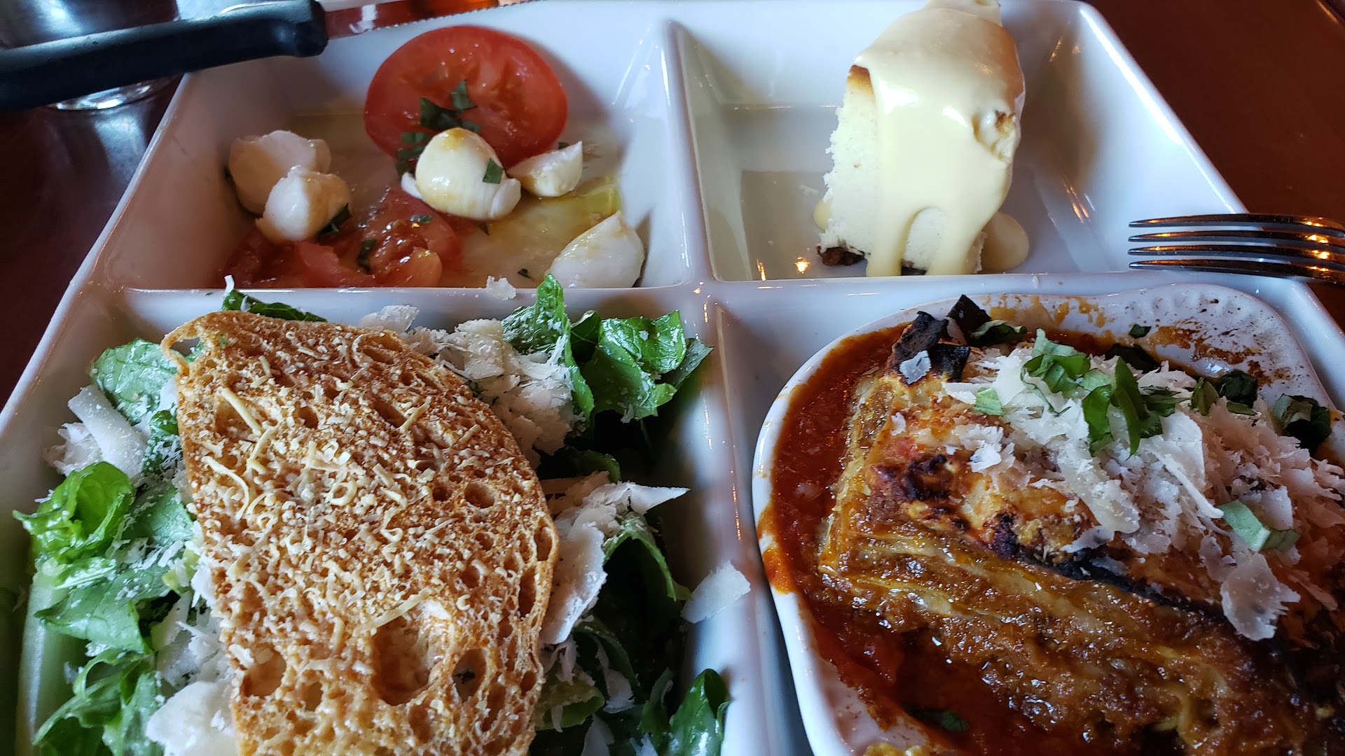 We ordered the "bento box" lunch special which is a fun idea I guess. Just weird to have your appetizer, side salad, main meal and dessert all arrive at the same time and on the same plate. She had the minestrone soup, mixed greens, eggplant parmesan and tiramisu. I had the bruschetta, ceaser salad, lasagna and cheese cake. Like I said above it was all decent(ish). The only real disappointment was the cheesecake. Wasnt a whole lot of flavor to it, even with the creme sauce on top. She had water and I had Ice tea to drink. Had to ask for a refill, despite being empty for 20 minutes and had to ask another waiter to find our waitress for it to happen. Due to slowness of the waitstaff we didnt leave until almost 3:30. So definitely set aside some time if you go here and dont be in a hurry, like at all. So about an hour and 40 minutes for the whole experience and to only get one refill, a meal all on one plate and a pizza to go. All in a place with maybe 10 customers? The cook/serve/wait on time doesnt even out.