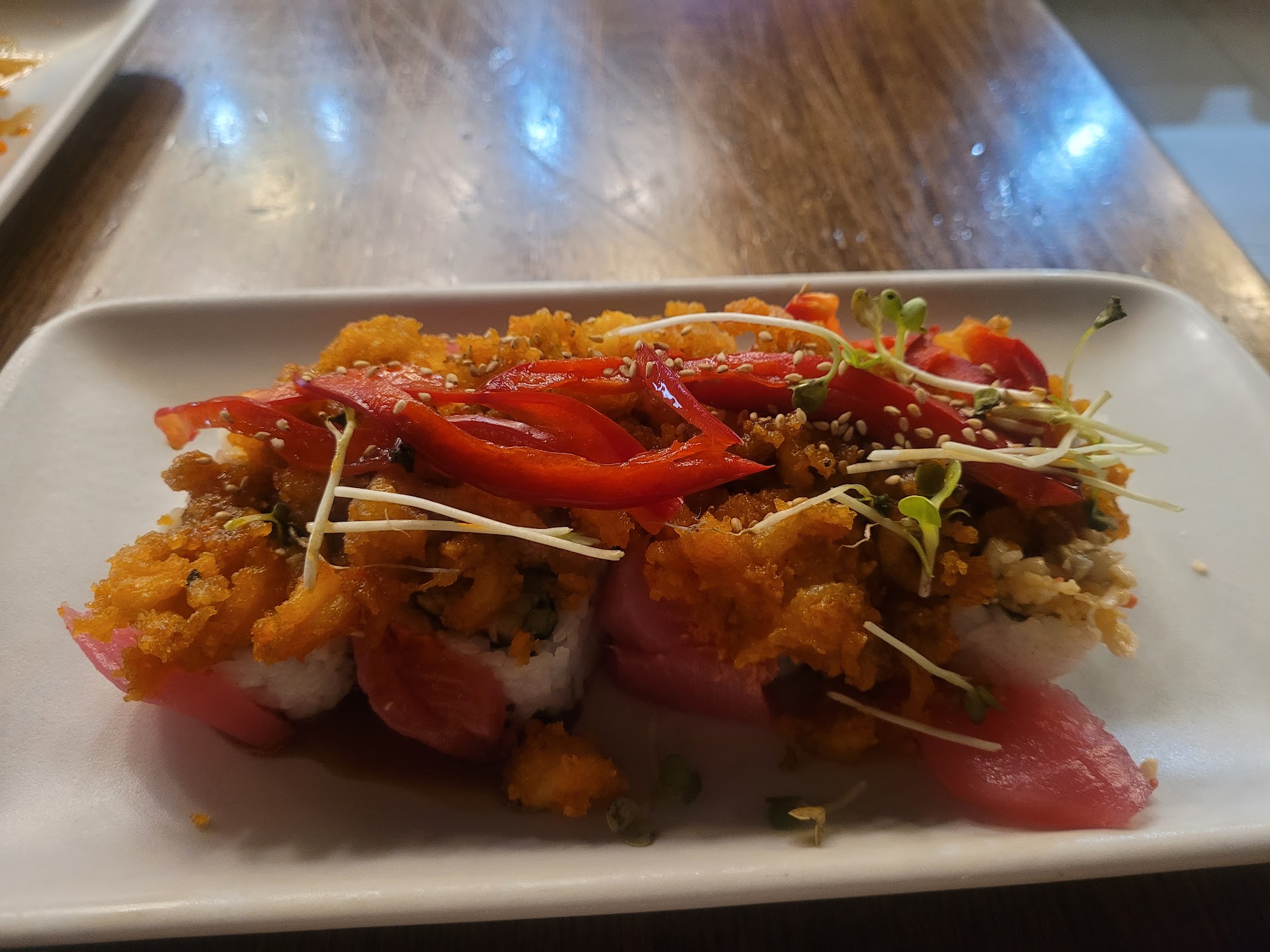The 2nd portion of this was a review I had saved from last year but didn't finish. I'm leaving it in because I didn't go there since that time & my review score didn't change this time. Yesterday: The good: The space was clean, seating was quick & the ambiance here has always been nice . Love the matcha iced tea, wish everyone did it this way. New options for combinations to feed multiple people to replace the all you can eat that is no longer available. The bad: Our server was abrupt, cold & not around much despite the fact it wasn't as busy as one would expect on a Friday night. The tempura green beans were soggy with oil instead of light & crisp like one expects from tempura batter. Also the same green beans & other appetizers were served so hastily that the sauce that comes on the side of the plates had sloshed all over the food making the bottoms soggy. The rolls were decent but most fell apart so, apparently poorly assembled. Prices are higher & they could benefit from more variety in the combo options.