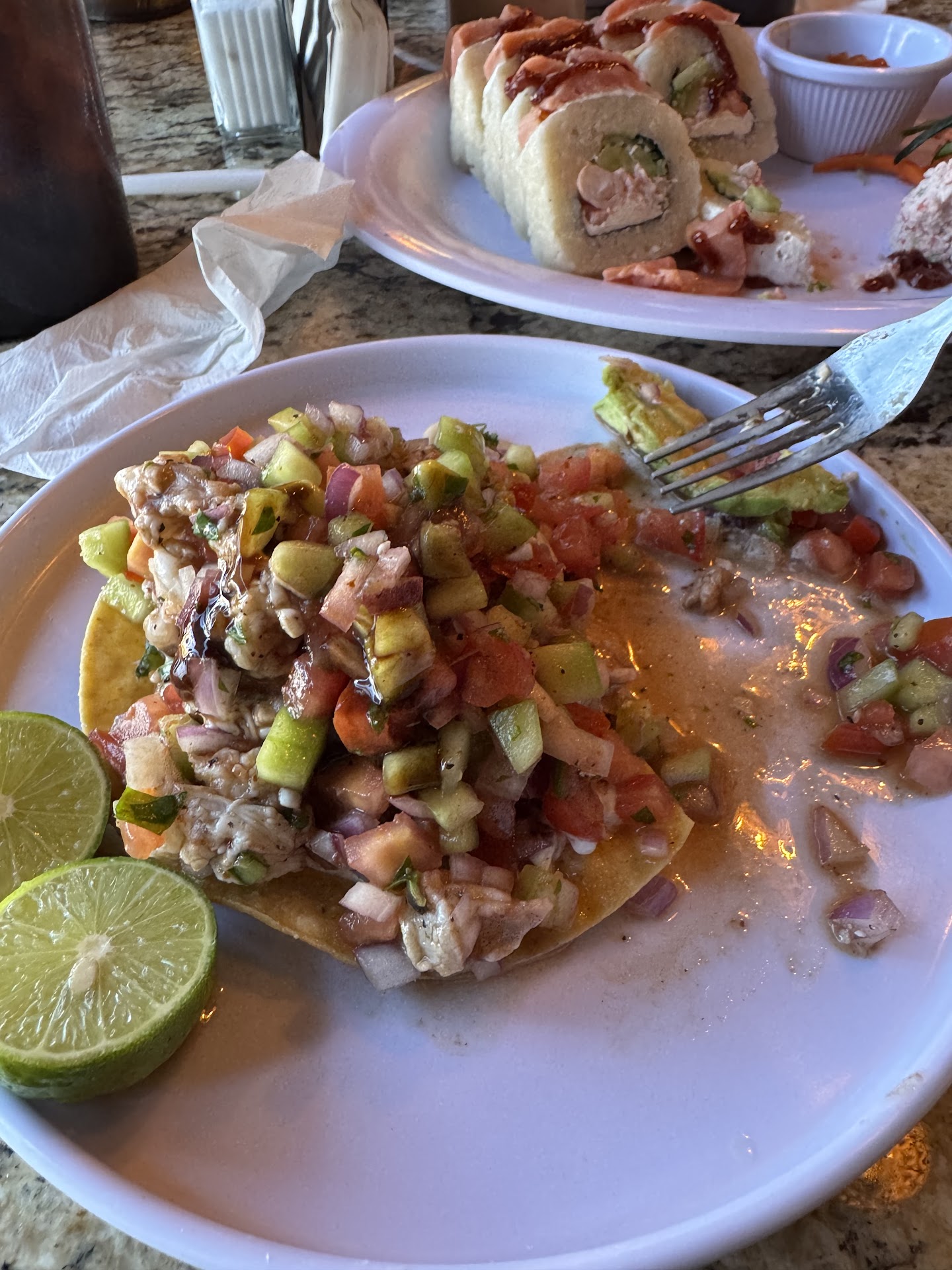 I ordered the dynamite roll, fried shrimp and cream cheese Inside, with salmon on top, and an order of the tostada with shrimp. My wife, a vegetarian, ordered the poblano roll, one of approximately two items on the menu not featuring meat.