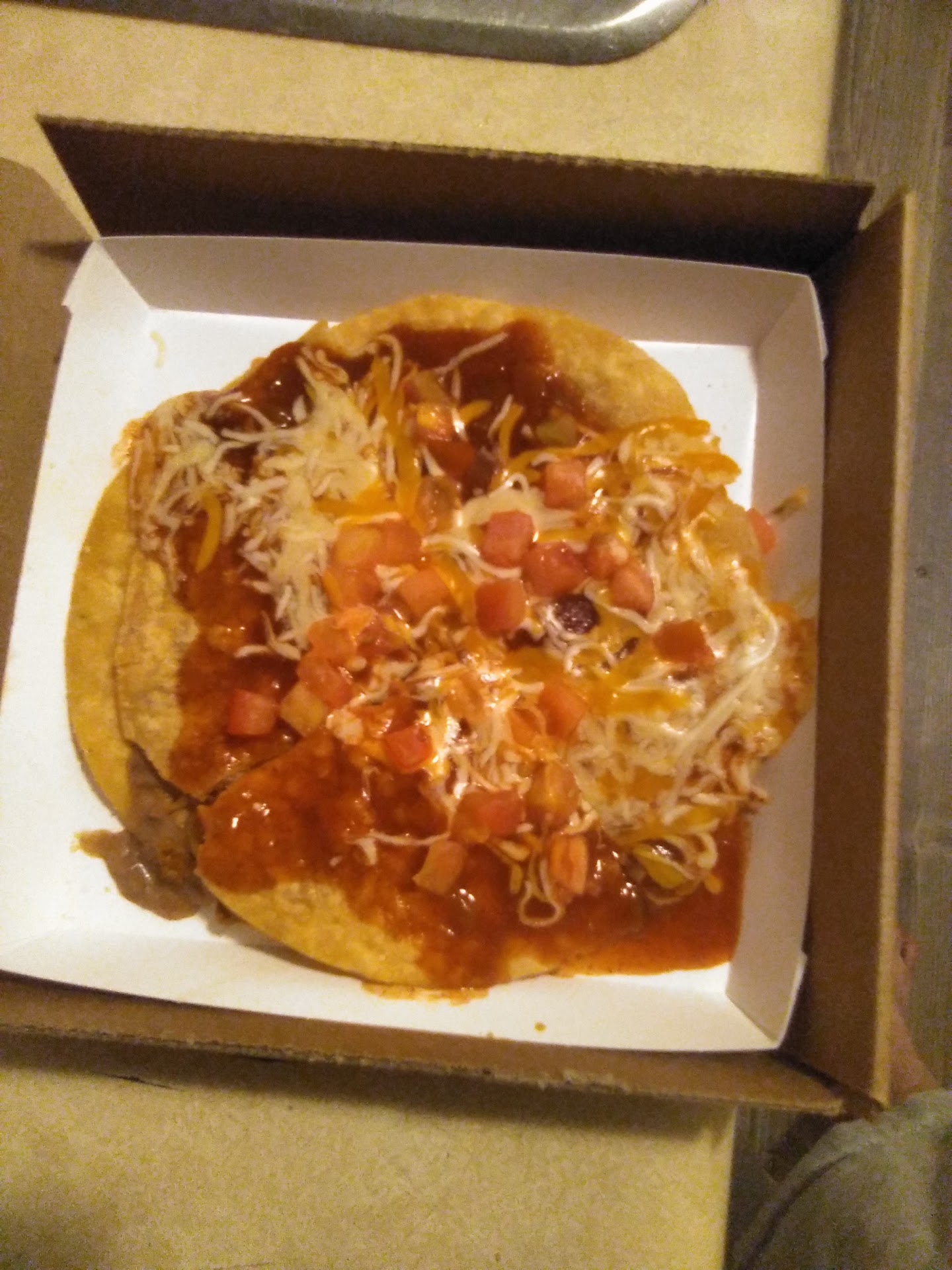 Just threw the enchirrito away. The food is fine. Still a 1 for the service. Or lack of. Drive thru probably would be a...