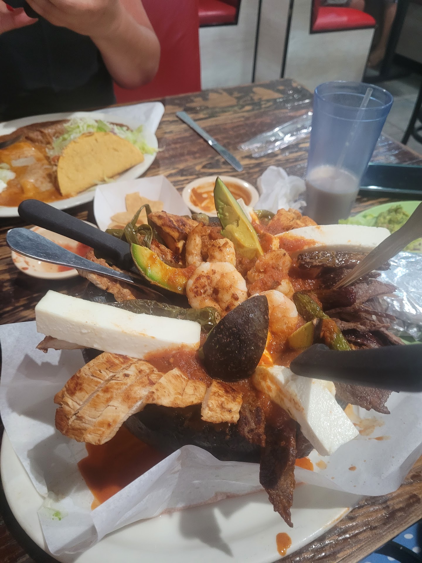 I've had mixed experiences here with my most recent one being the poorest. The menu is HUGE! There are tons of amazing options but it can be overwhelming to make a choice. On my various trips I've had: culichi enchiladas, homerun! (Shrimp and pablano sauce) Taco Giro combination plate. Very good. Enchilada and tamal were my favorite Molcajete mixto: a heated stone bowl filled with nopalitos, shrimp, chicken, beef, avocado, peppers and queso fresco. Plates of tortillas beans, rice and condiments on the side.