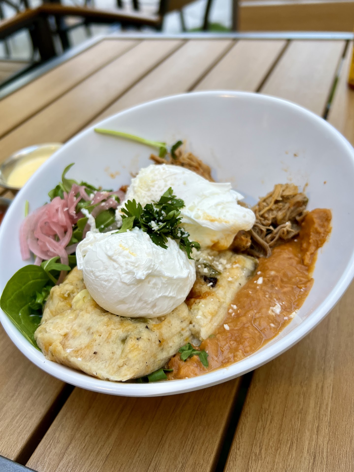 The place itself is beautiful, especially the outdoor area, which is very thoughtfully designed. However, the food leaves much to be desired. I ended up eating refried beans with unwashed arugula and a piece of bread. I asked for an avocado add-on and was given three small, inedible pieces because they were completely unripe. I mentioned this to the waitress, who simply said, "they're all like that" — meaning none of the avocados were ripe — and she offered no further solution.