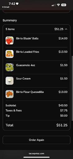 To be fair the food was good, though I specifically ordered tacos with consomme sauce, it came with the order! Expressed I live far and was already hating the fact the food would be soggy by the time I reached home. Bag given tied up so I didn't untie to ensure the sauce wouldn't leak ....only to find out later I didn't have the sauce!!!!! WTH!!! JUST some spicy hot sauce and green sauce I never asked for! I was so pissed because they were closed by the time I reached home! I don't eat out, too scary to eat from places though I visited Tacospot in PHX fell in love with Cantaloupe juice! My son is my go to when I want birria and we not Spanish in no shape form or fashion and his sauce I could drink! No match yet! Though Tucson Tacospot if I pay 14+ for taco with consomme sauce it is what I expect! Piss me off the whole night, and today! Though the tacos were good would have been better with my sauce I paid for yet not received! I'm a size 4-6 I fluctuate! So not a big person raging about food, just a person who wants what I pay for...broke my lil heart...
