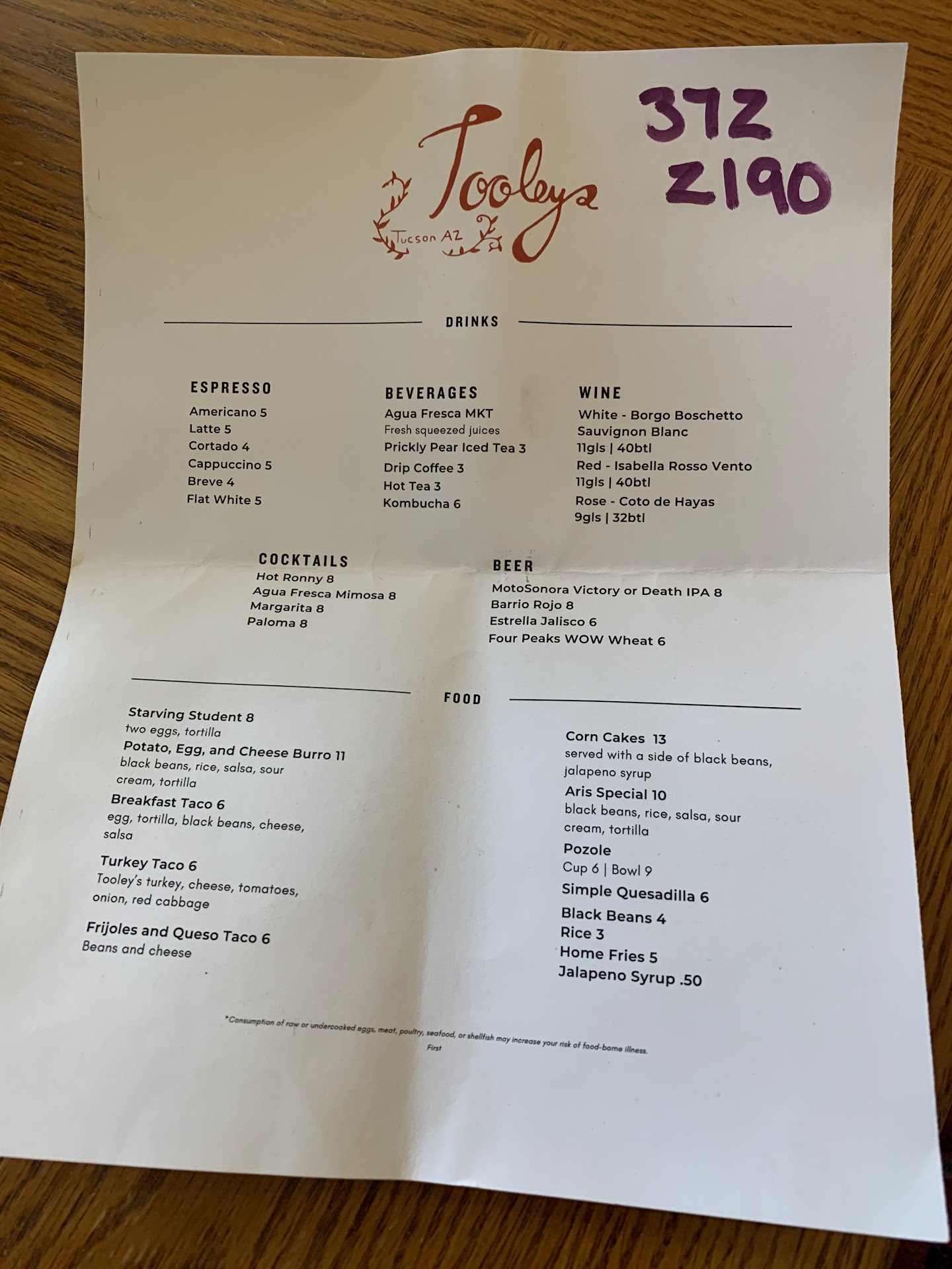 During a recent shopping trip at The Lost Barrio, my friends and I happened upon Tooley's Cafe. We found out that the cafe has had it's ups and downs over the years and yesterday was a soft opening after being closed for 6 months. What a revelation those corn cakes with candied jalapeno and turkey tacos were! Everything was light, fresh and delicious. My friends enjoyed the mimosas and margarita. Good thing I was driving because they said they were strong, but so tasty they wanted to order a second one! My cortado was made with just the right balance of espresso and milk, served hot! We finished with a yummy chocolate chip cookie. Eating outside is a delight in Tucson and there is a large porch to enjoy your goodies. Their menu is small for now and they will expand the offerings in the...