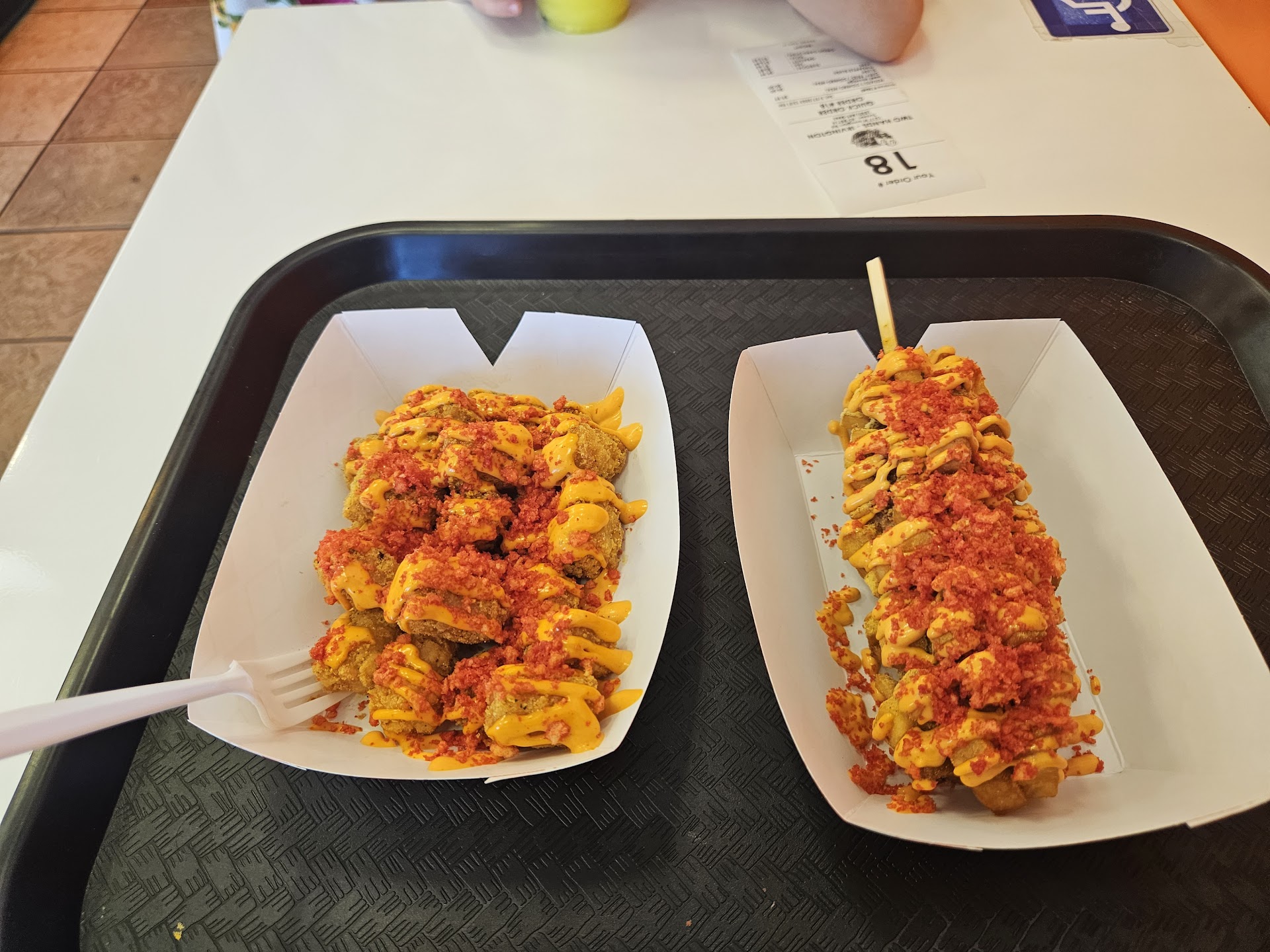 To complement my Potato Dog, I also ordered a side of their Dirty Fries. These fries were generously topped with mouthwatering ingredients that made them irresistible. The tator tots, coated in the special sauce and cheeto powder, took the fries to a whole new level. The blend of savory spices, melted cheese, and other delectable toppings created a heavenly combination. They were the perfect accompaniment to my exceptional corn dog experience.