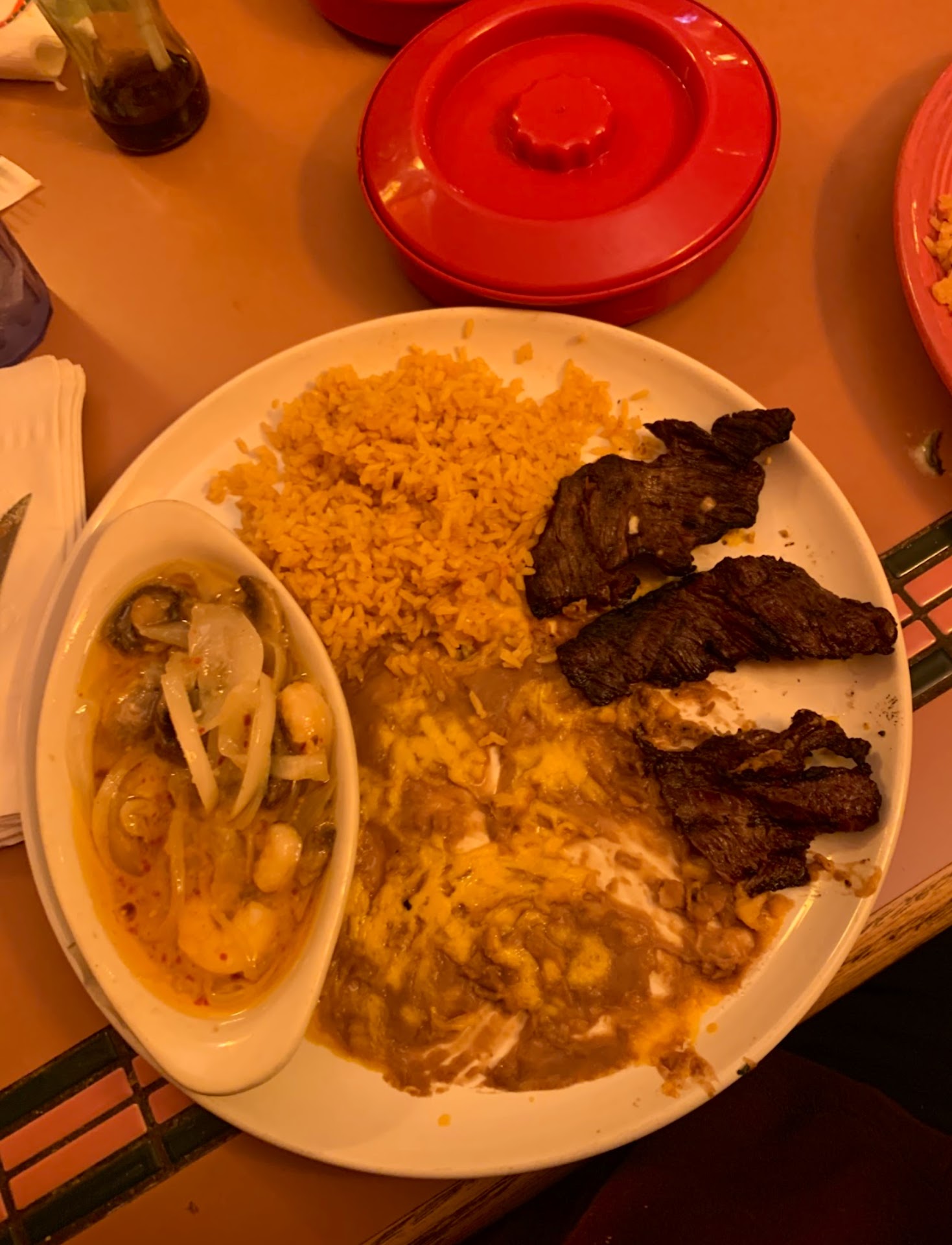 Next, I moved into the Palto, by starting with the Chili Reano, which I thought was chicken by the SIZE OF IT. It was good, but not AS SPICY AS I THOUGHT IT WAS GOING TO BE. I was surprised by the breading and how HUGE it was. MOUTH SAVORING GOOD. I was able to finish this side before I moved to the PROTIEN of the meal Carna asada.