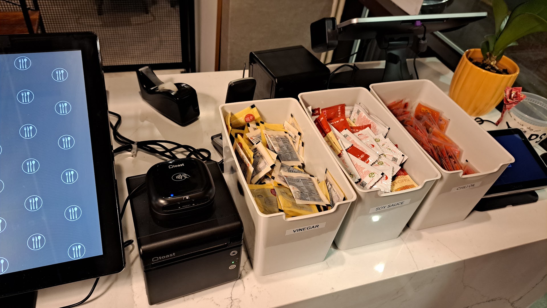 There is a table to the right of the entrance set up for take out orders. There is a tablet for ordering, as well as utensils and sauce packets.
