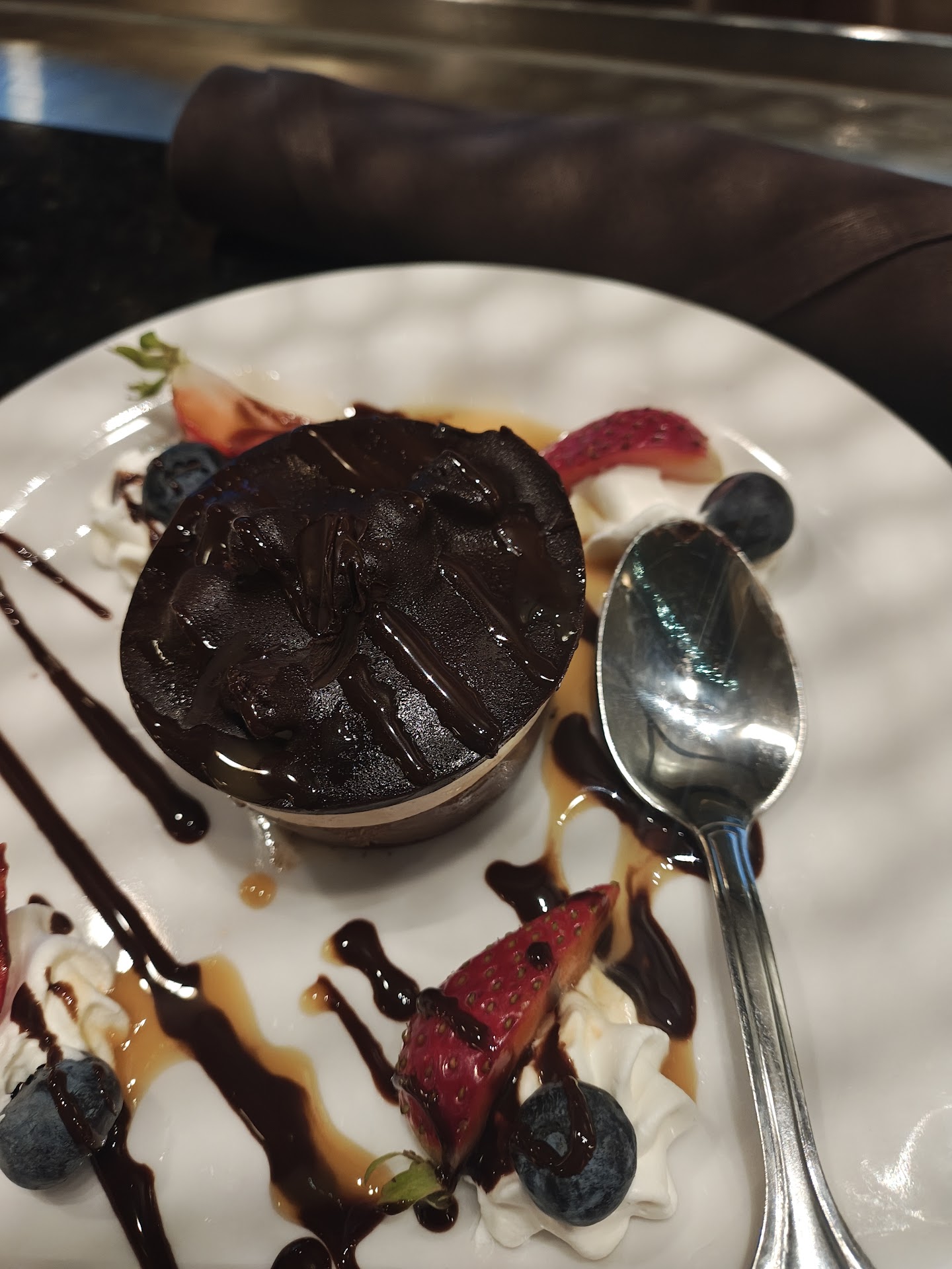 Read moreOof. Triple Chocolate Cake ... What a sad excuse of a dessert. $8. Hard as a rock. Might see where I attempted to open it up.... When I got a spoon into it with the force that would break the plate, it fractured. What an embarrassment... The poor lady working the bar said she was aware of the silliness of this plate. She offered to bring the manager over... The manager is aware of the trash they are selling. I did not even attempt to eat it... My teeth would not win that battle.