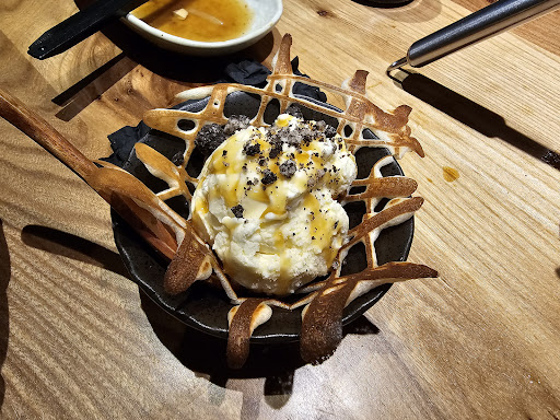 Dessert was interesting, but the look doesn't add a lot to the flavors. The vanilla ice cream was good overall with oreo crumbs, but the dorayaki or taiyaki criss-cross design was strange and slightly burnt on one side. The strawberry mini puffs were not that good. The strawberry cream inside was alright, but that cold puff on the outside was strange. However, I'm not a puff person, but Beard...