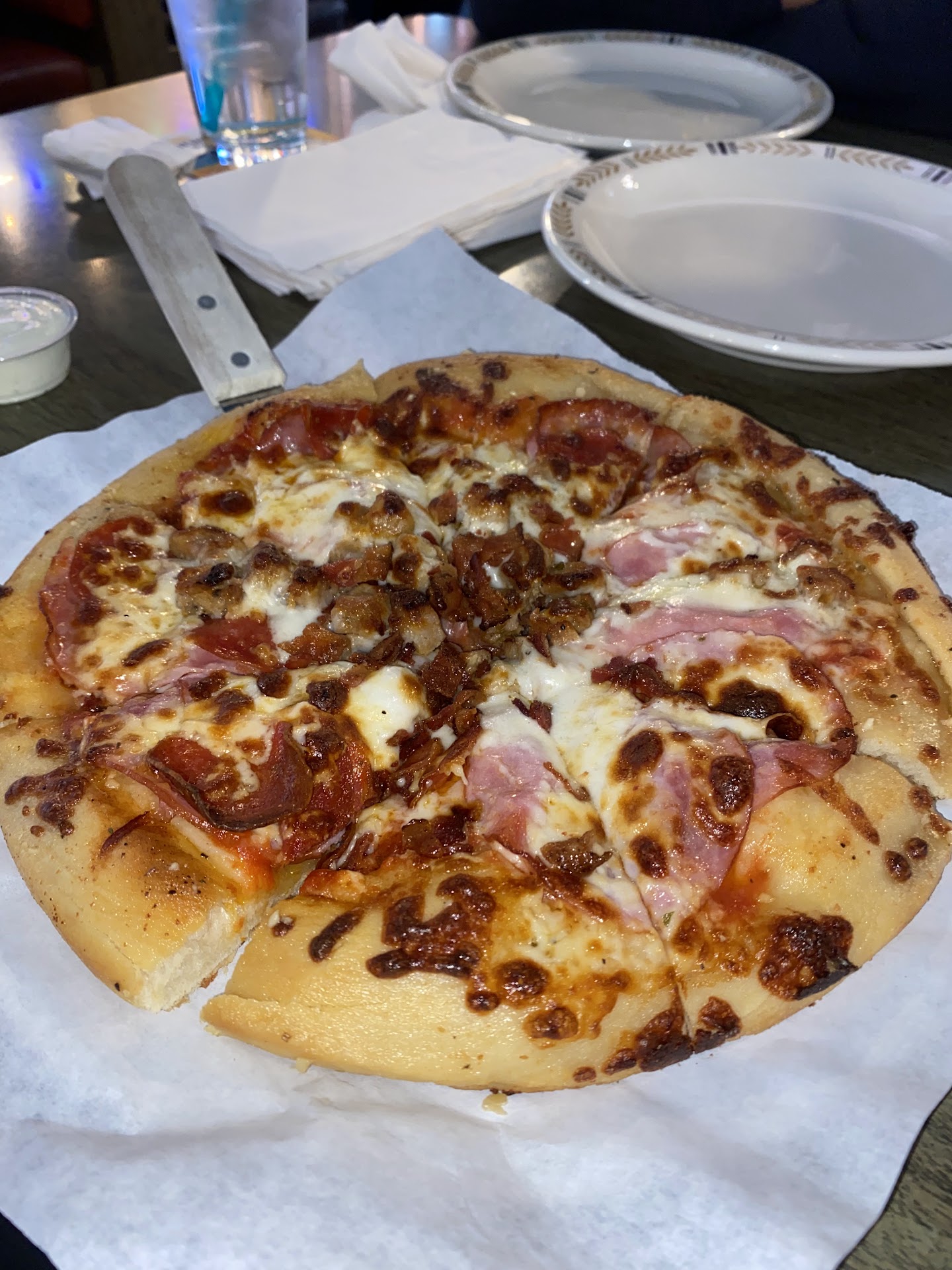 Pizza was good and fairly priced at $19 for a medium- more than enough for one person. Definitely more bar than restaurant. Music was loud, but not quite too loud. Also, I’m pretty sure one of the “regulars” yelled “Home Depot boys” at a Hispanic family as he was leaving. So...