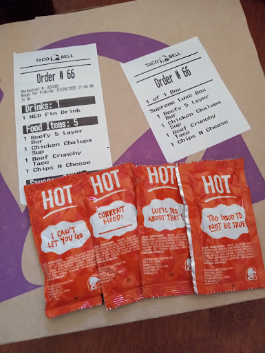 Read moreI used the online app to place my order... 3 crunchy tacos, no lettuce, with extra cheese (which I paid extra for on each taco). A simple order right??? Or at least you would think so... Instead what I received was 3 crunchy tacos with beef and light on the cheese!!!! I didn’t notice until I’d got home, so I began calling them so that I could speak with the manager about how upsetting that I paid for something I didn’t get!!! And even though I continued to call for over an hour and they NEVER ANSWER the phone!!!! Nobody was in the drive thru and of course the dining room is closed, so you KNOW they weren’t busy!!!! Yet, when I constantly continued to call no one would answer, instead I got an answer machine that kept repeating “We’re sorry we are experiencing a high volume of customers at this time. Please call back shortly.”