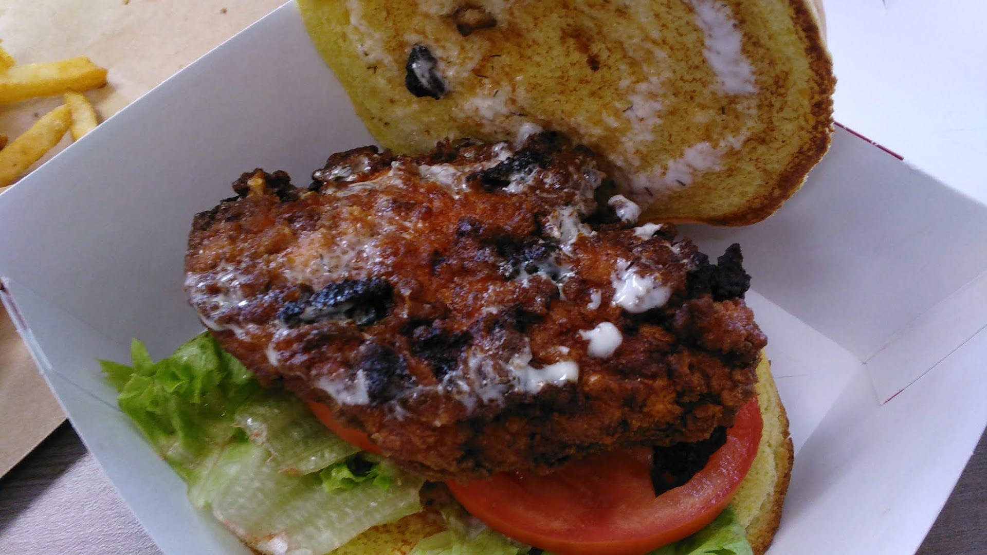 The food... I am including photos of the chicken sandwich which was burned black... The lettus was clearly the nasty outer leaves that most would toss in the garbage when prepping... I removed it from the sandwich... The creamy dill ranch dressing was almost not existant...