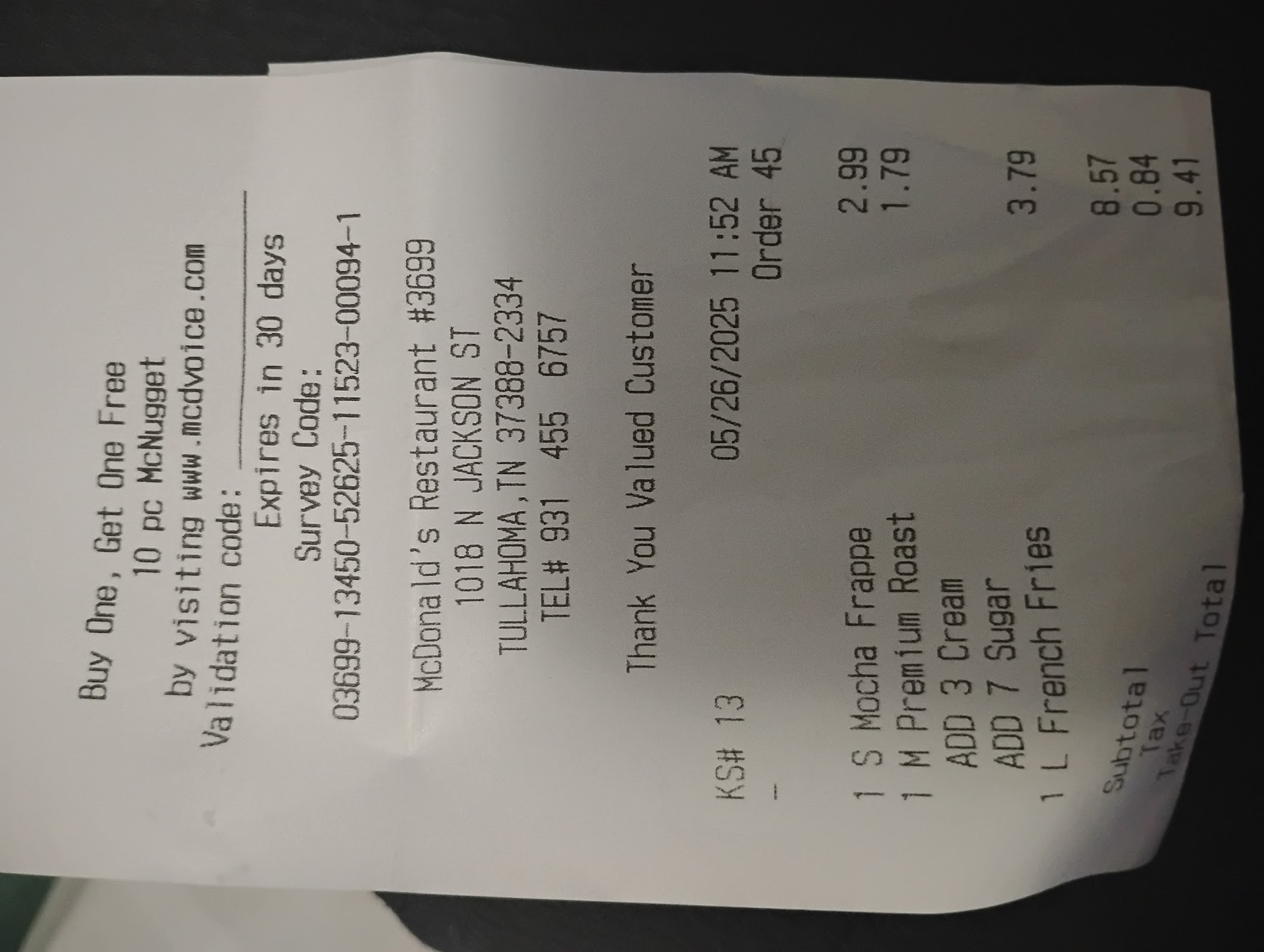 Read moreSo we came to the McDonald’s up here in tullahoma, and it started off great ordered our food, sat down and started eating. Then this young nice gentleman was out cleaning the lobby, and all we heard coming from the kitchen was the manager and other employees raising there voice, bossing this kid around telling him how to do his job when he was already doing it how he’s supposed to do it by the book. They told him to use the wet floor signs when he mopped, he was already using them, then they told him to come bag some order, he went over to start bagging then they turned him right back around and told him to go back to the lobby.