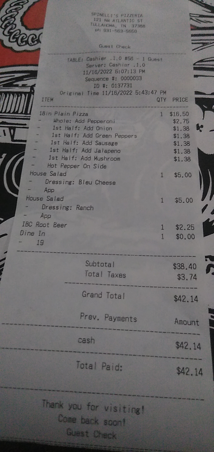 Read moreI guess Spinelli's is well known up north... but I have to wonder if they keep tabs on their more distant locations like Tullahoma, Tennessee.